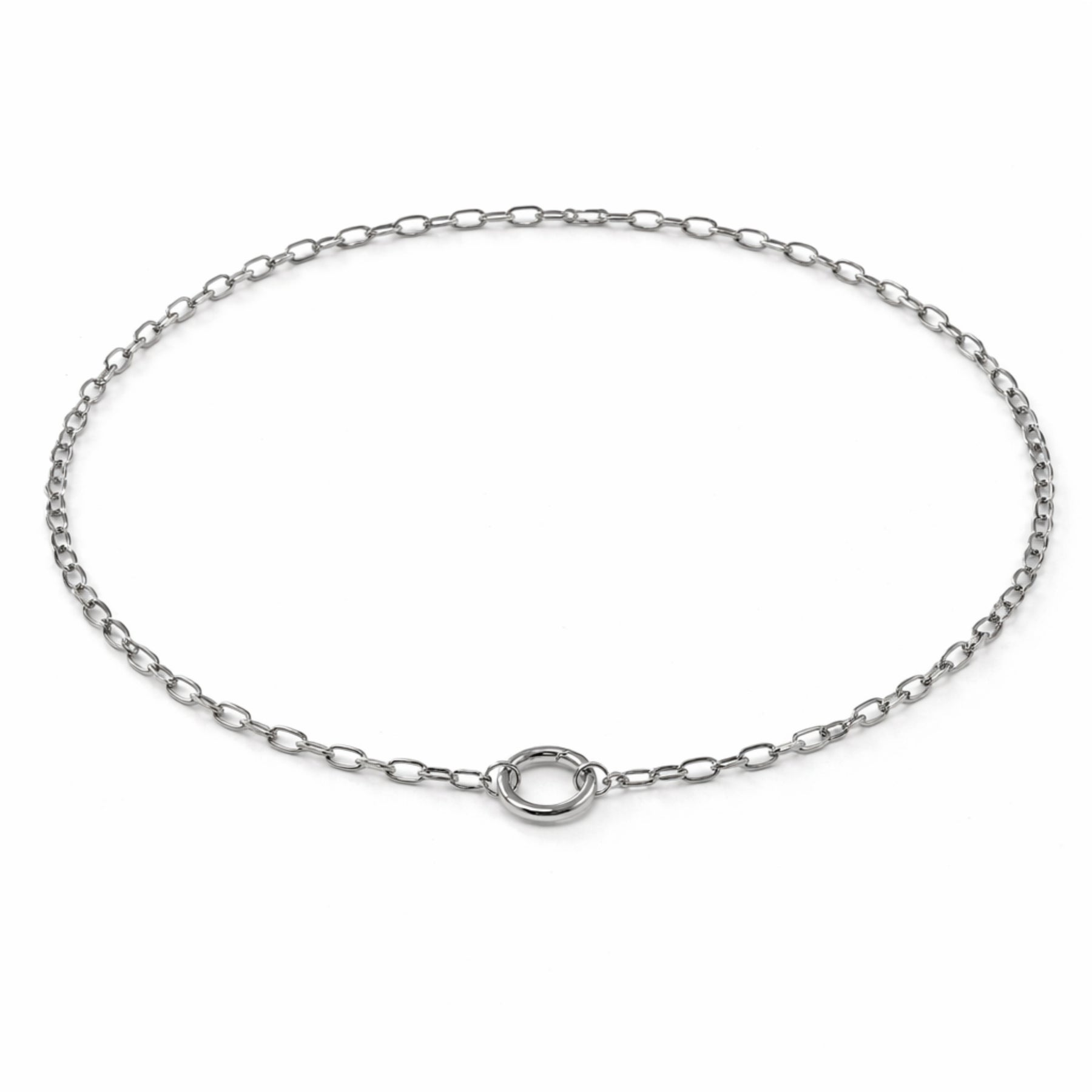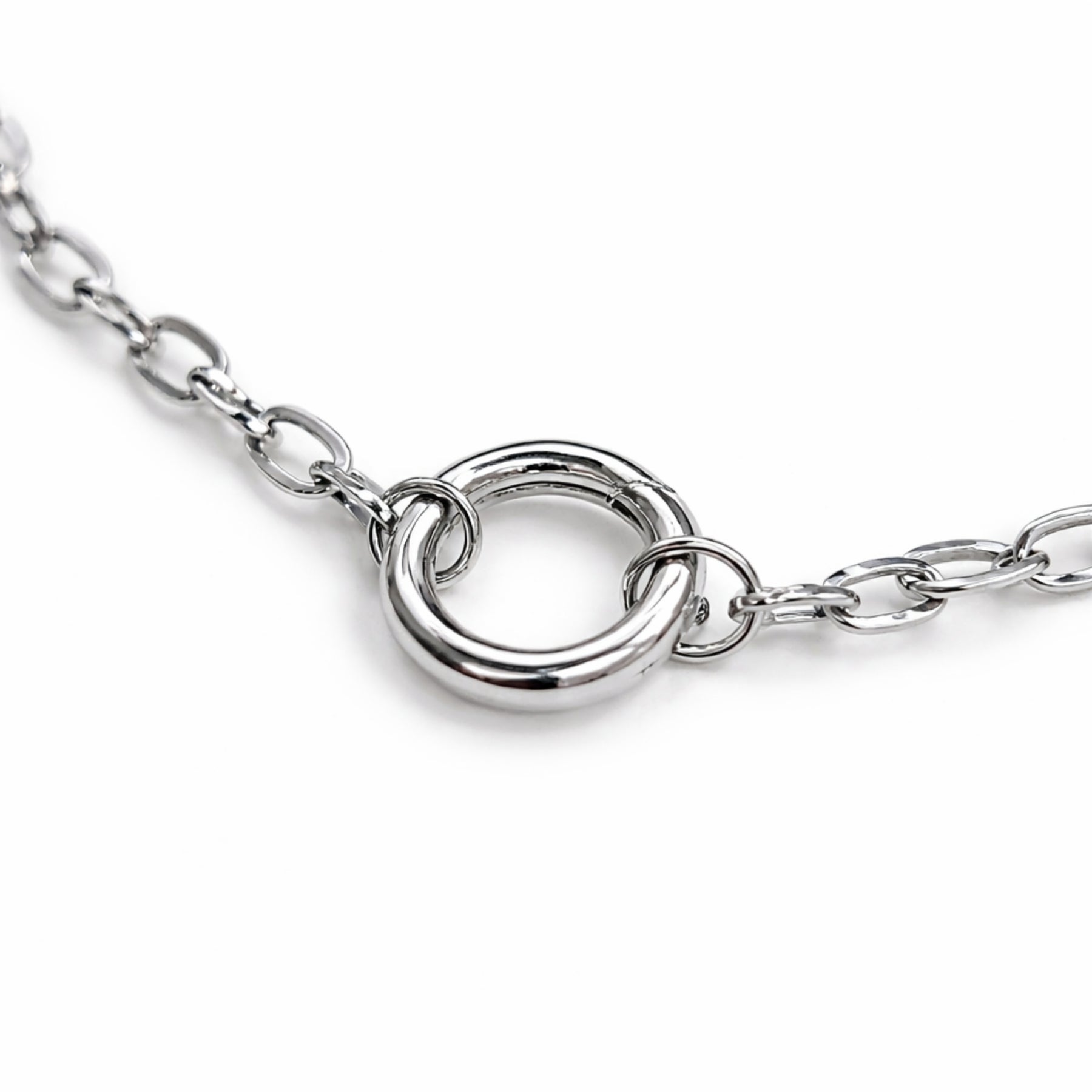 Cadena plateada elaborada en acero inoxidable con broche circular de chapa de oro.
