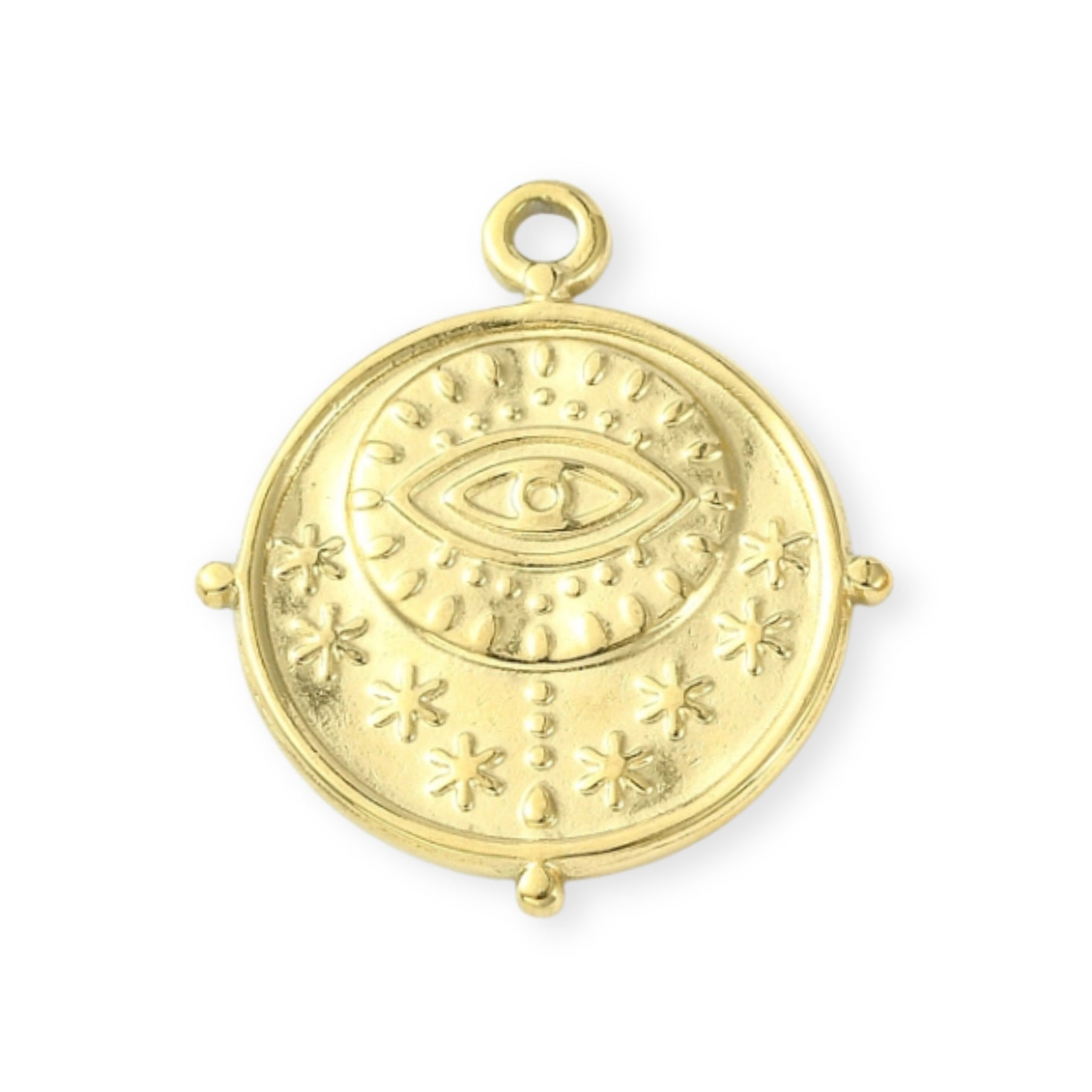 Dije circular de ojo elaborado en acero inoxidable con detalles de estrellas alrededor.