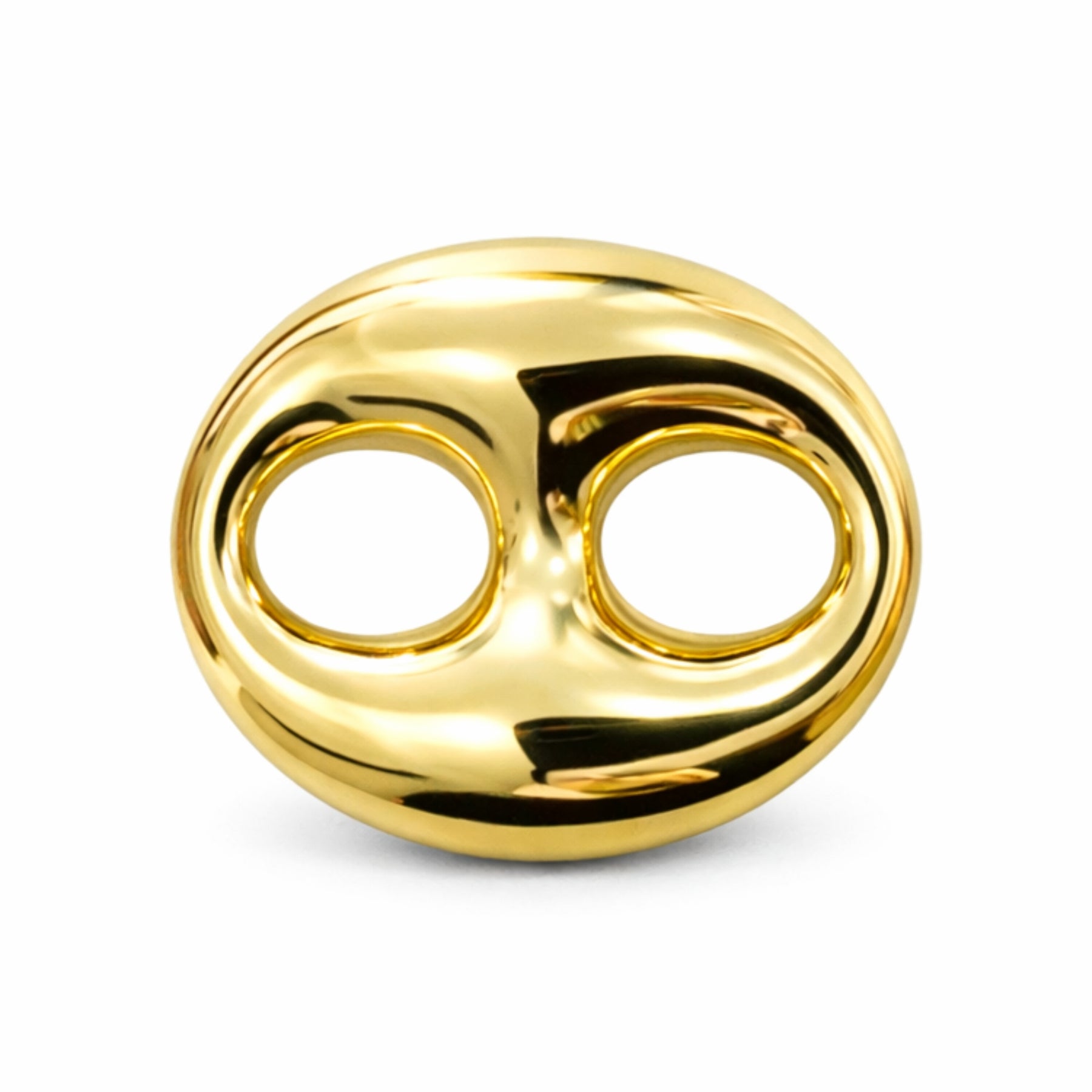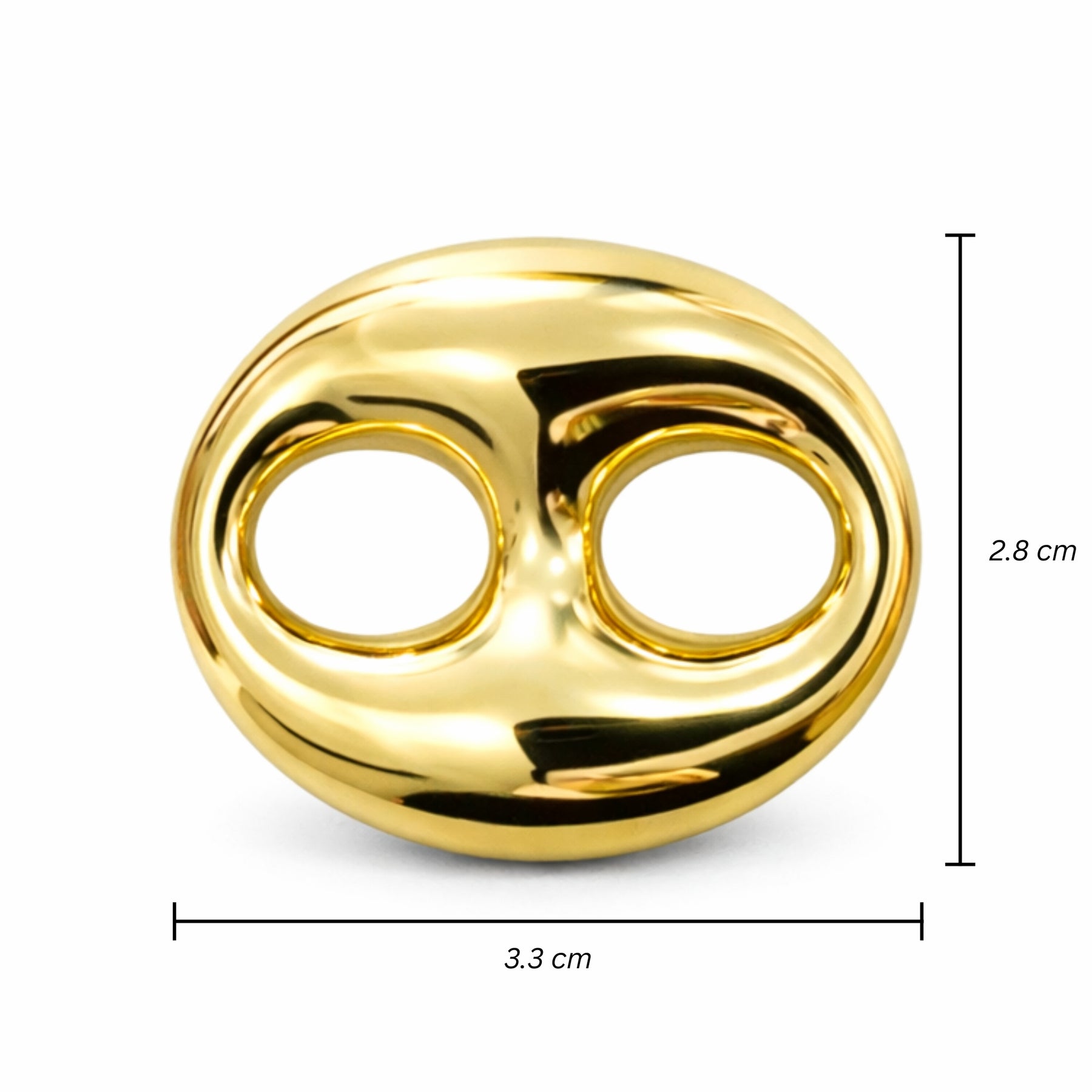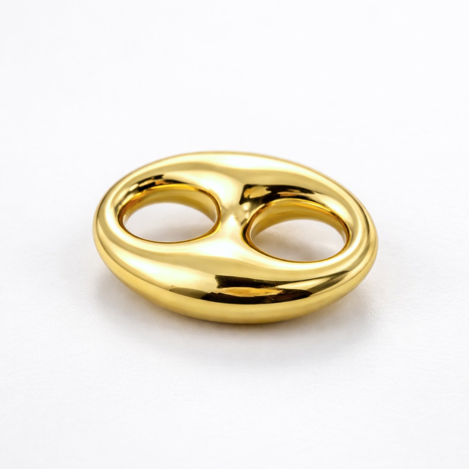 Conector ovalado elaborado en chapa de oro con doble orificio para armado de joyería.