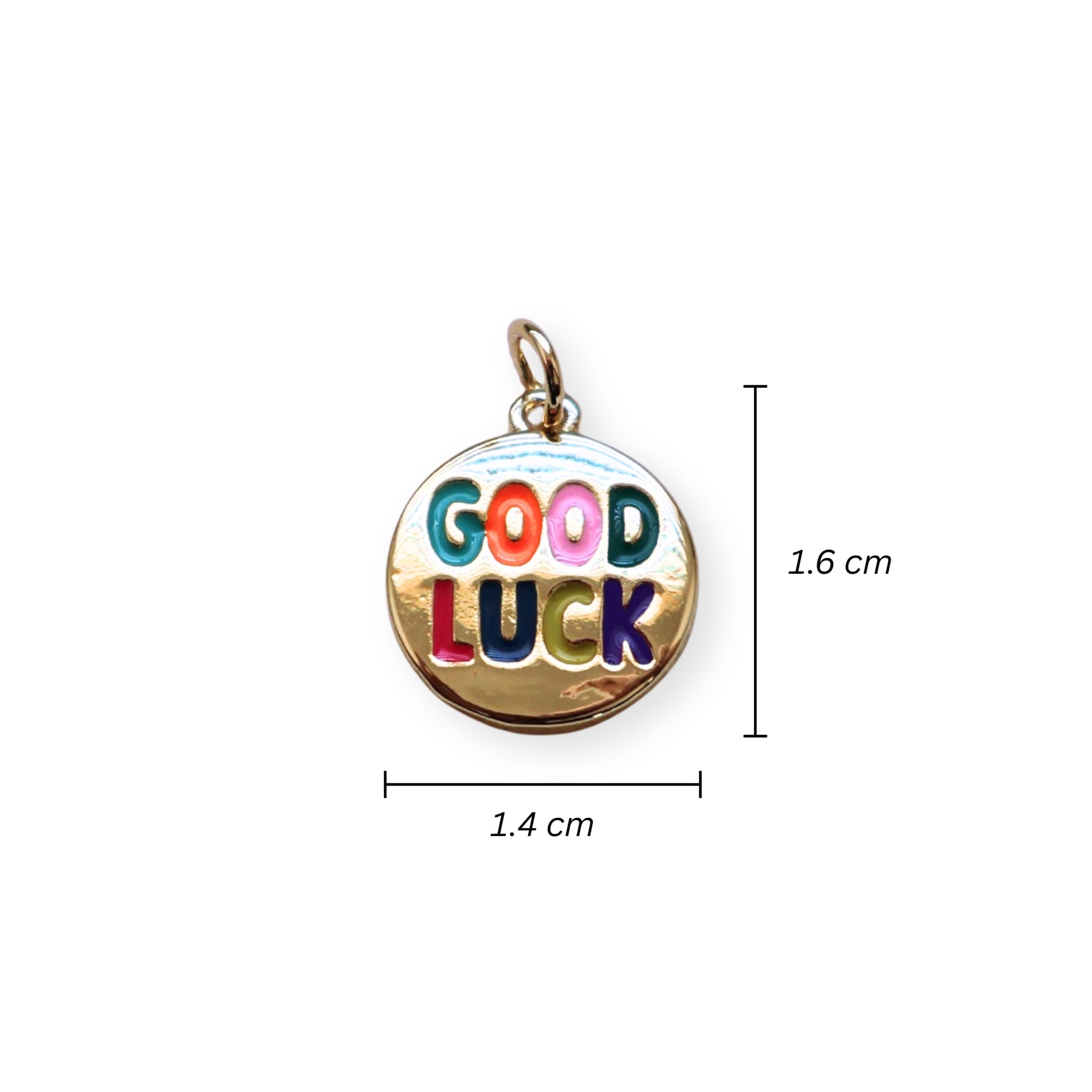 Dije circular dorado con grabado “Good Luck” y esmaltado en colores vivos