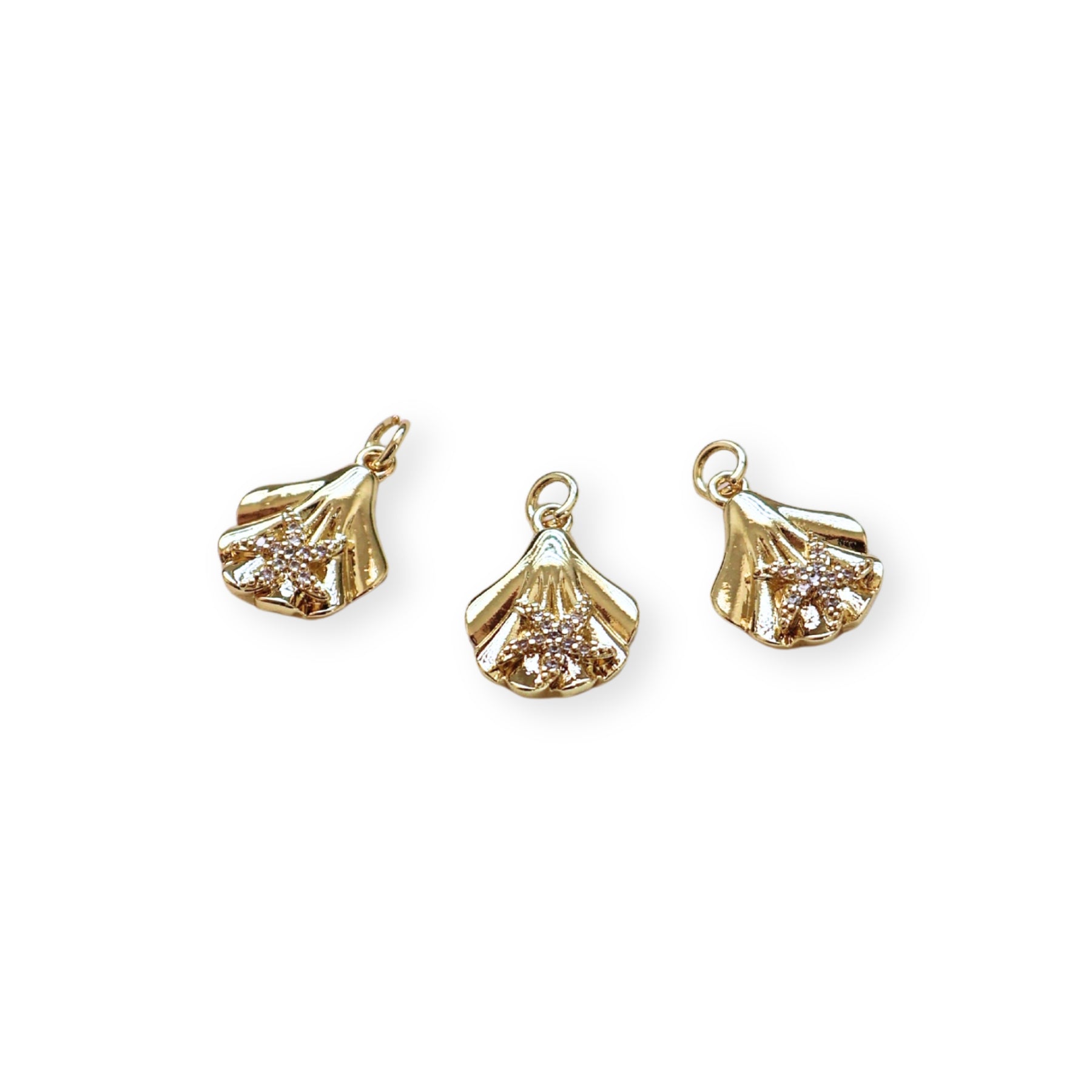 Dije en forma de concha elaborado en chapa de oro, con una estrella de mar en zirconia sobre la concha.