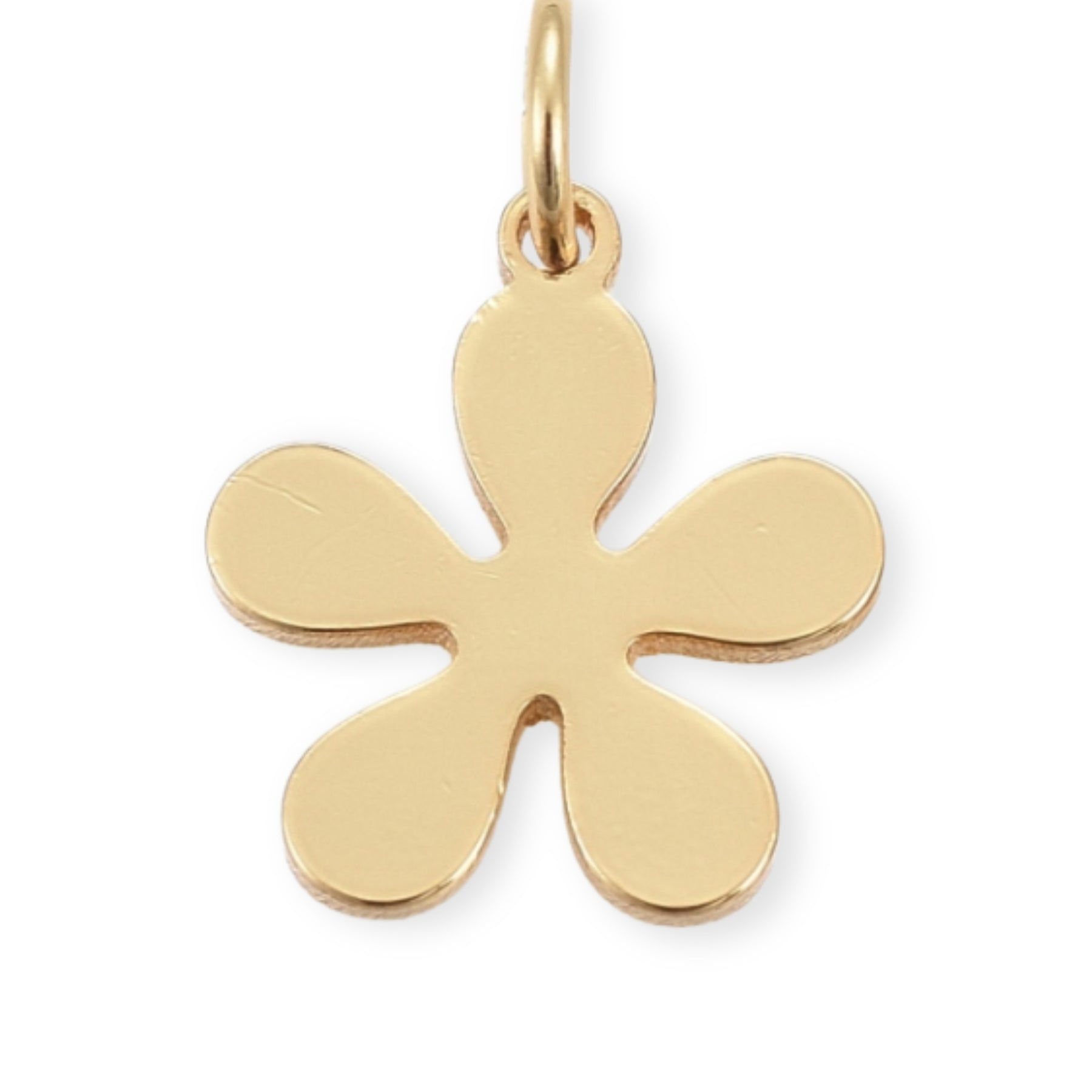 Dije en forma de flor elaborado en chapa de oro con acabado brillante.
