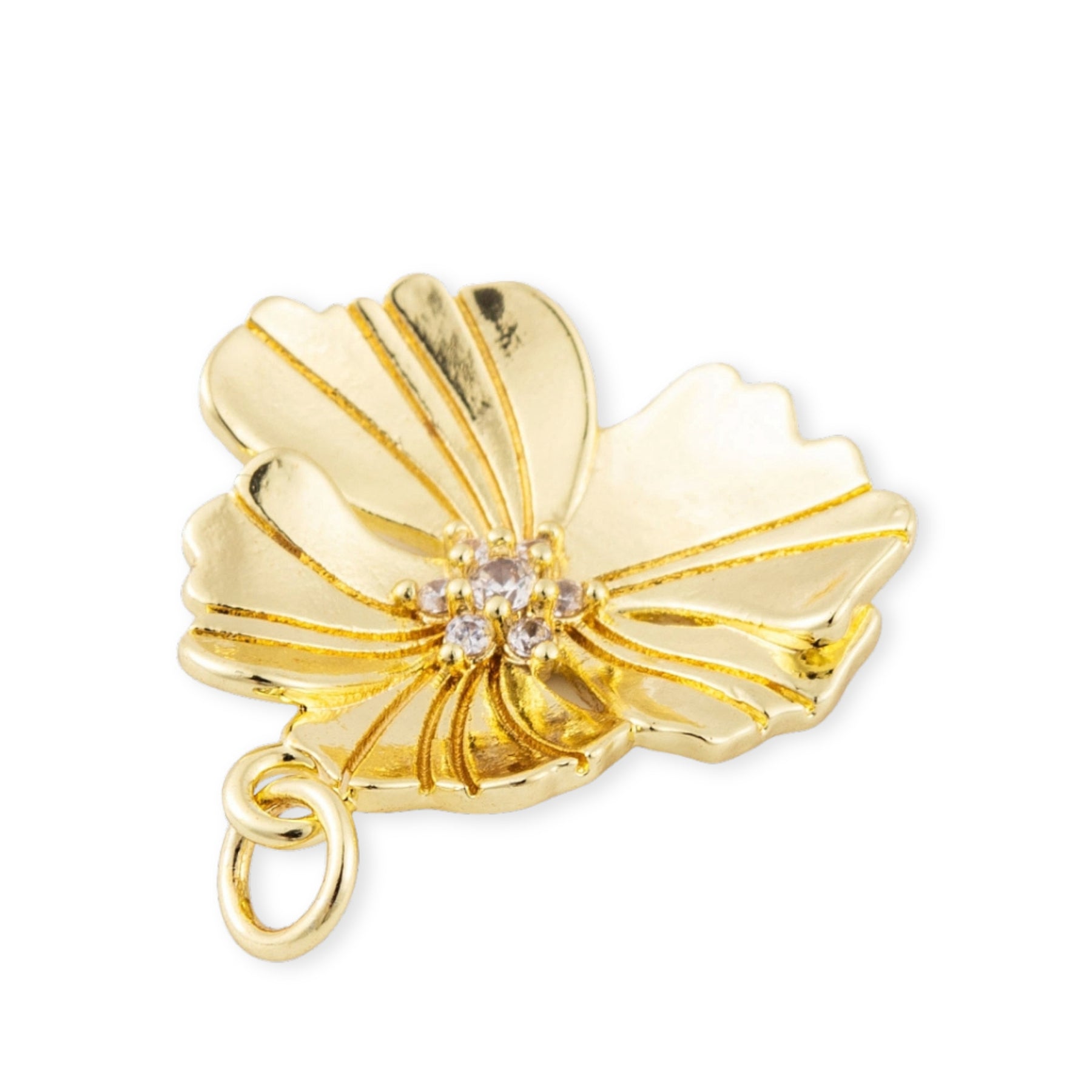 Dije en forma de flor elaborado en chapa de oro, con zirconia incrustada en el centro.