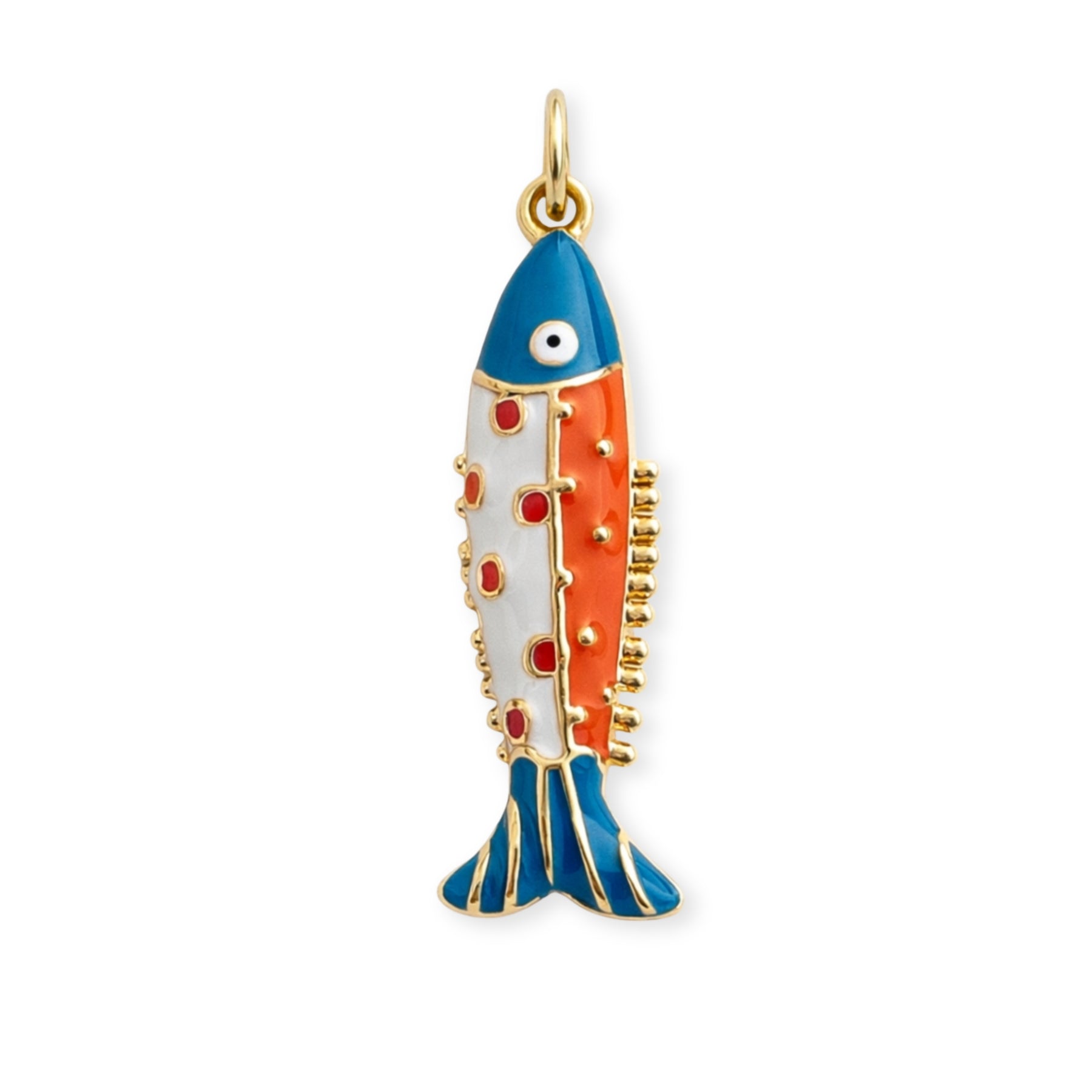 Dije en forma de pez elaborado en chapa de oro y cubierto con esmalte.