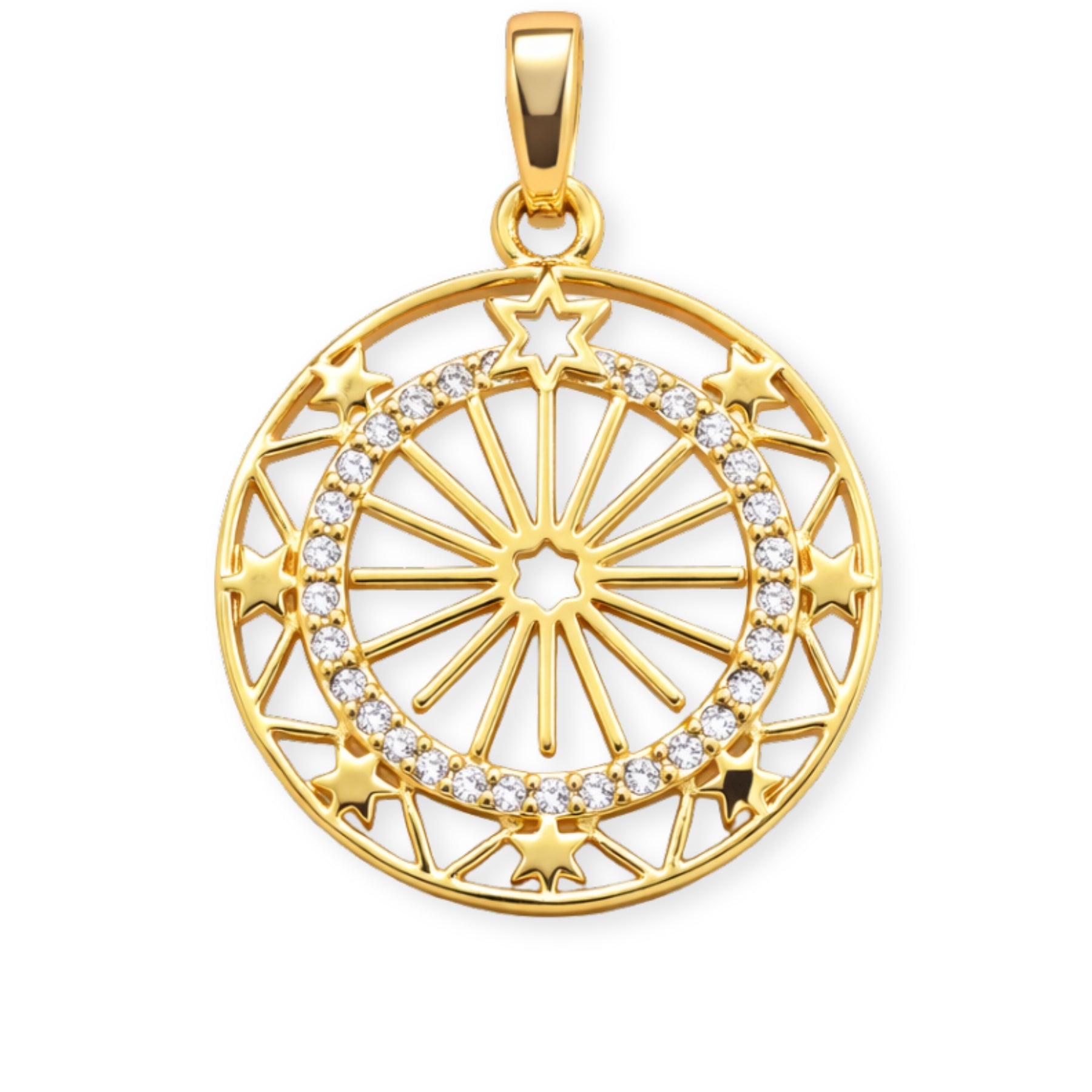 Dije circular de sol de chapa de oro con zirconia