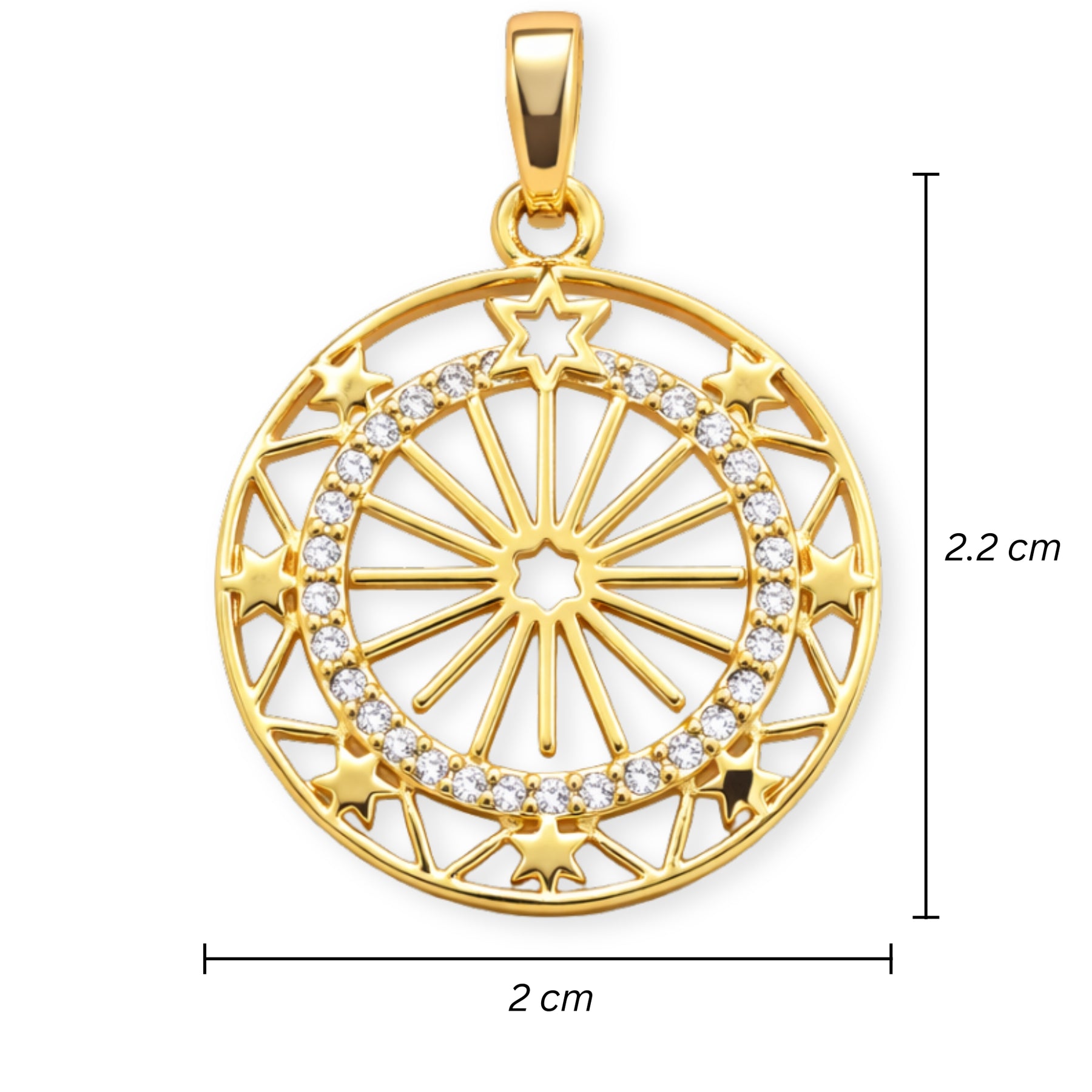 Medidas para Dije circular de sol de chapa de oro con zirconia