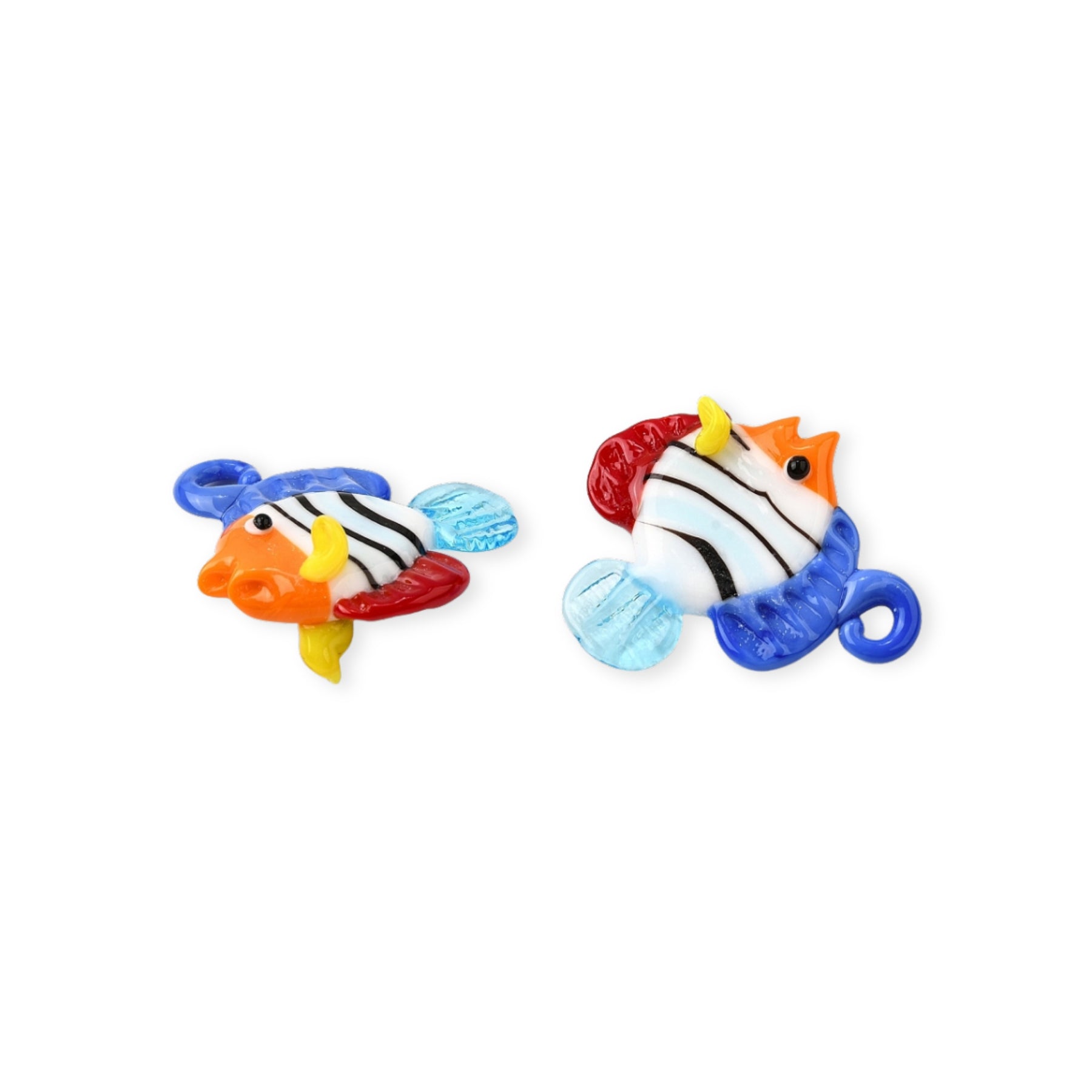 Dije de murano en forma de pez con combinación de colores: blanco, azul oscuro, rojo, azul claro, naranja y amarillo.