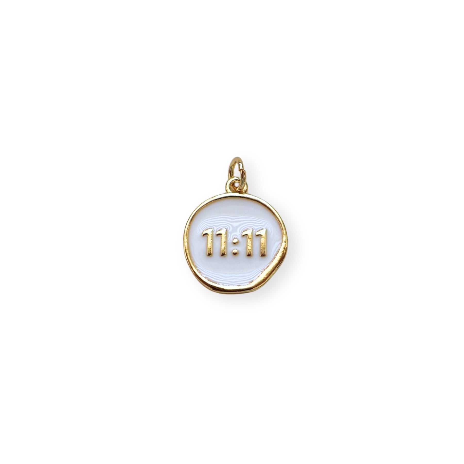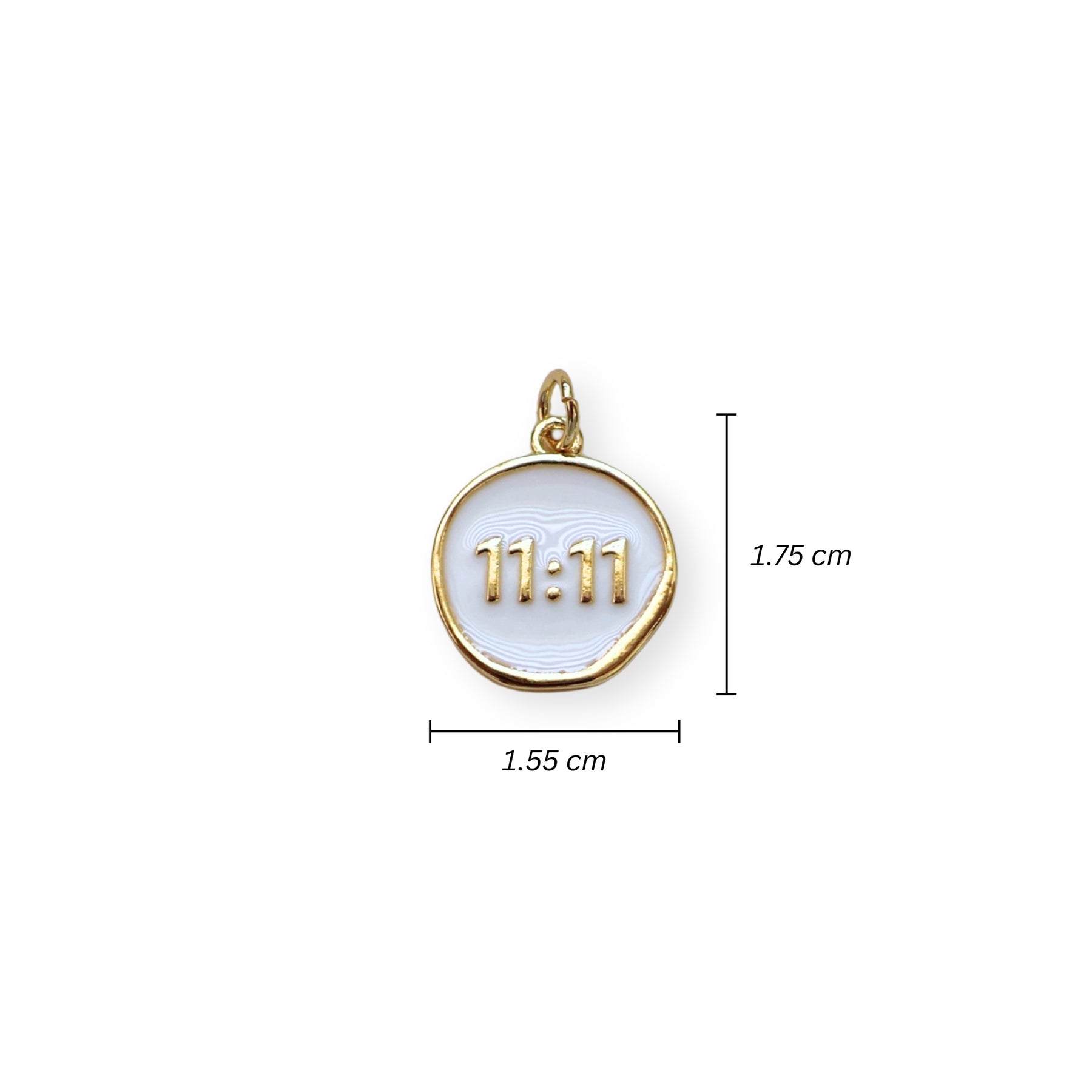 Dije circular elaborado en chapa de oro, con el detalle “11:11” en el centro cubierto con esmaltado blanco.