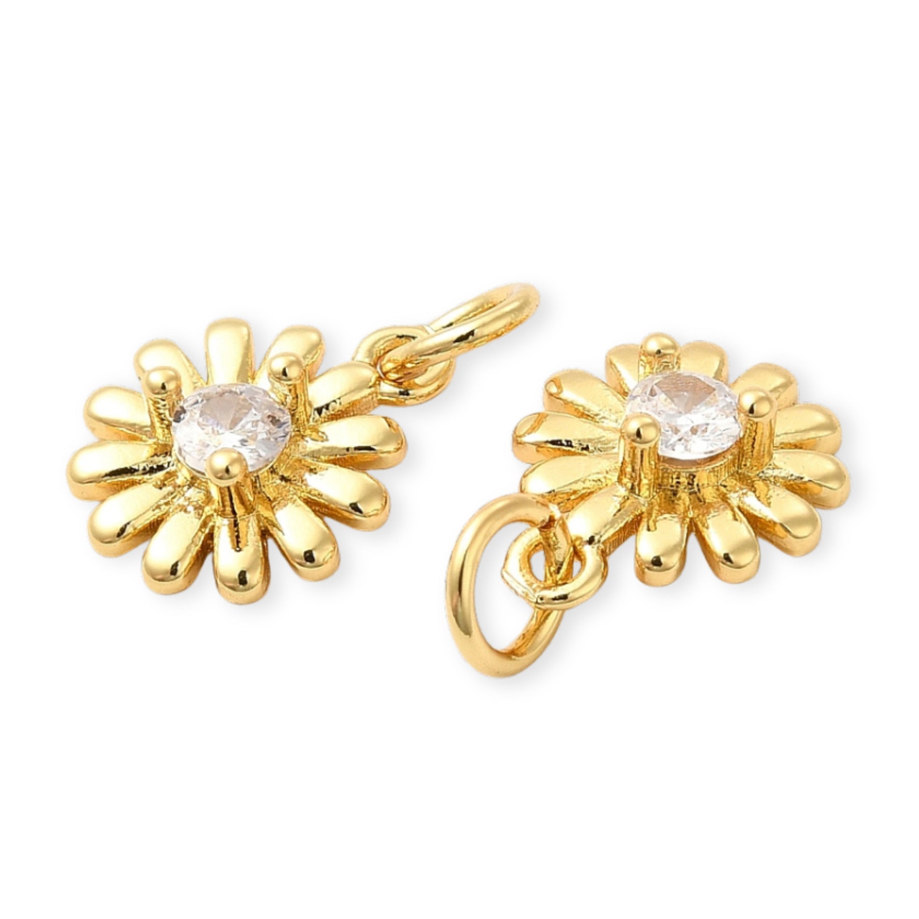 Dije en forma de flor de chapa de oro con zirconia en el centro.