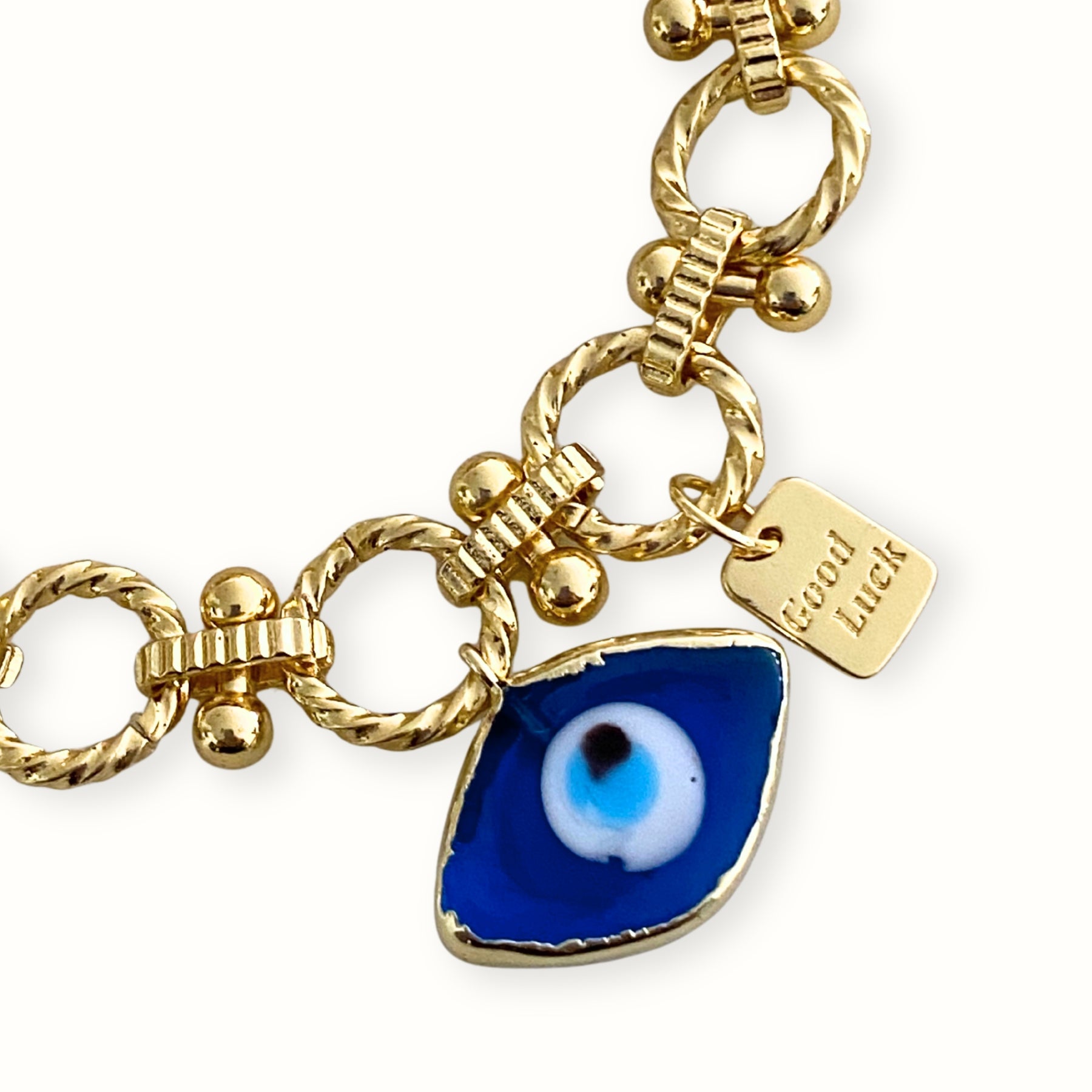 Adjustable gold-plated chain bracelet with beveled Murano glass Turkish eye charm in gold plating and rectangular charm engraved with “Good Luck”.