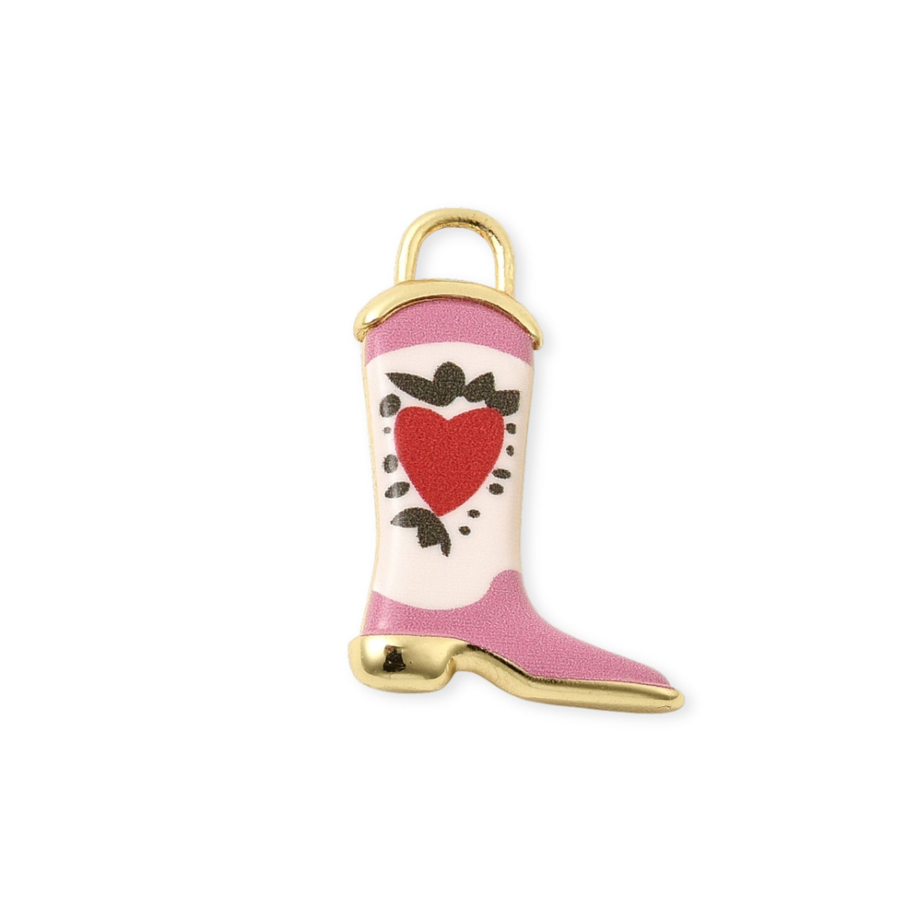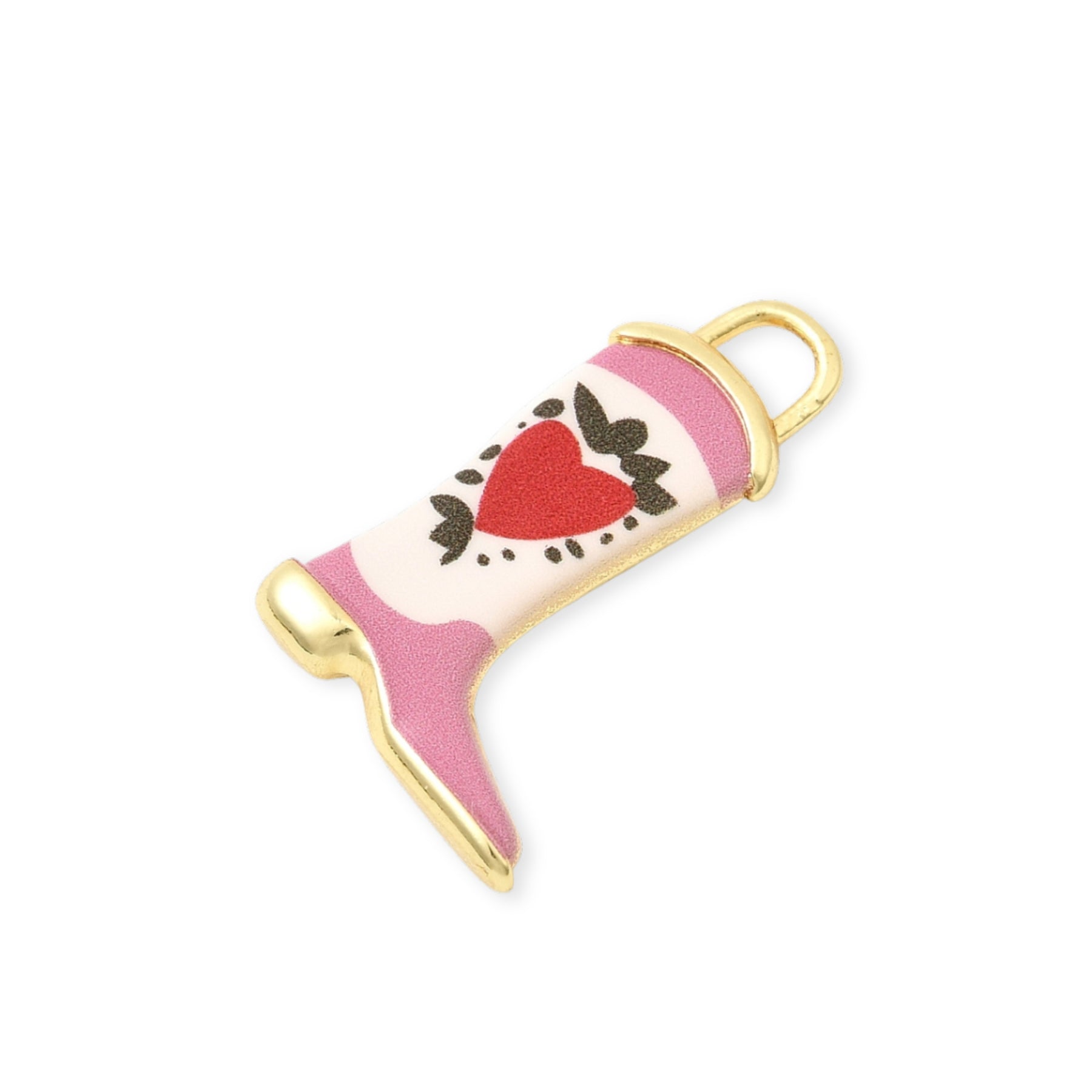Boot-shaped pendant made of gold-plated metal, decorated with pink enamel and a red heart detail.