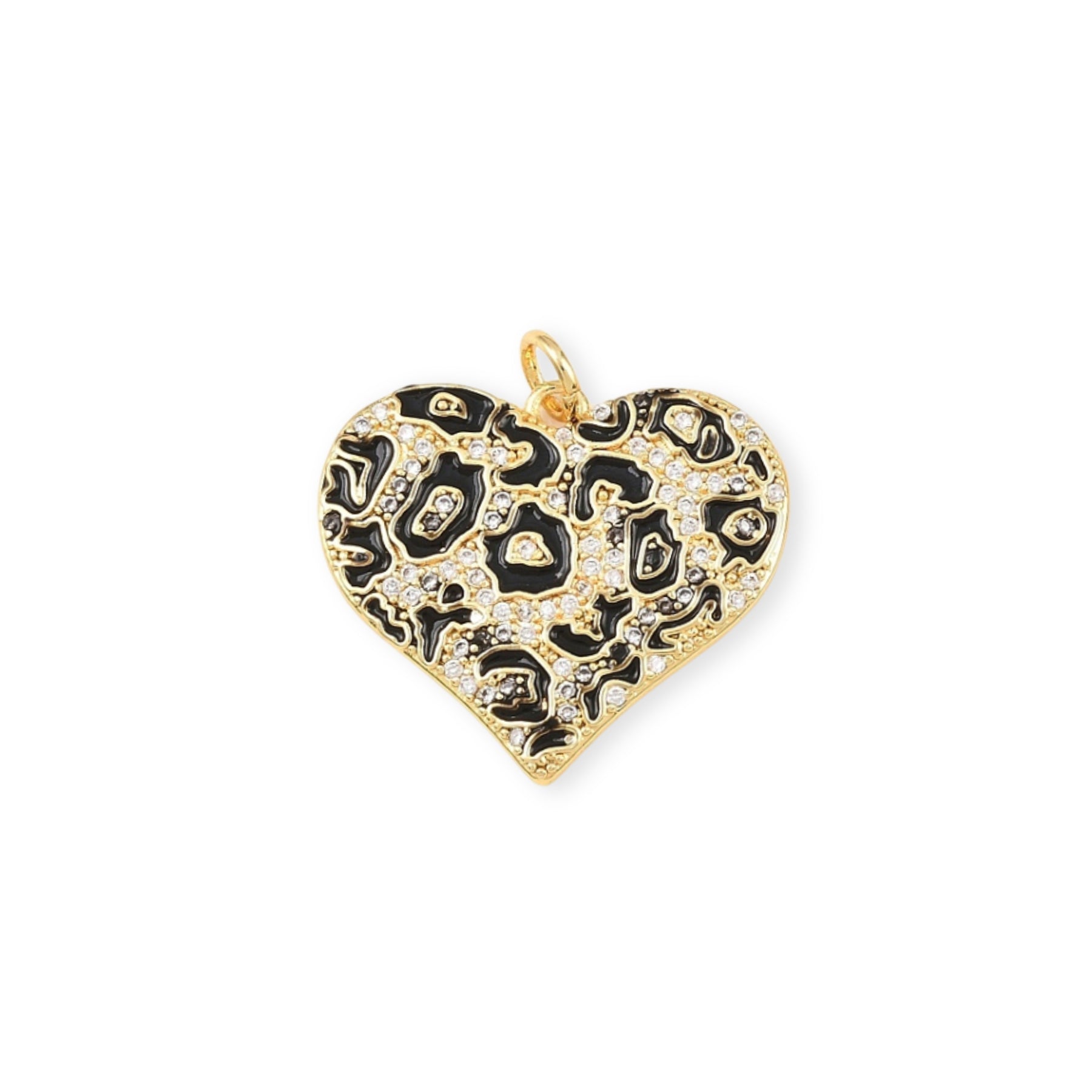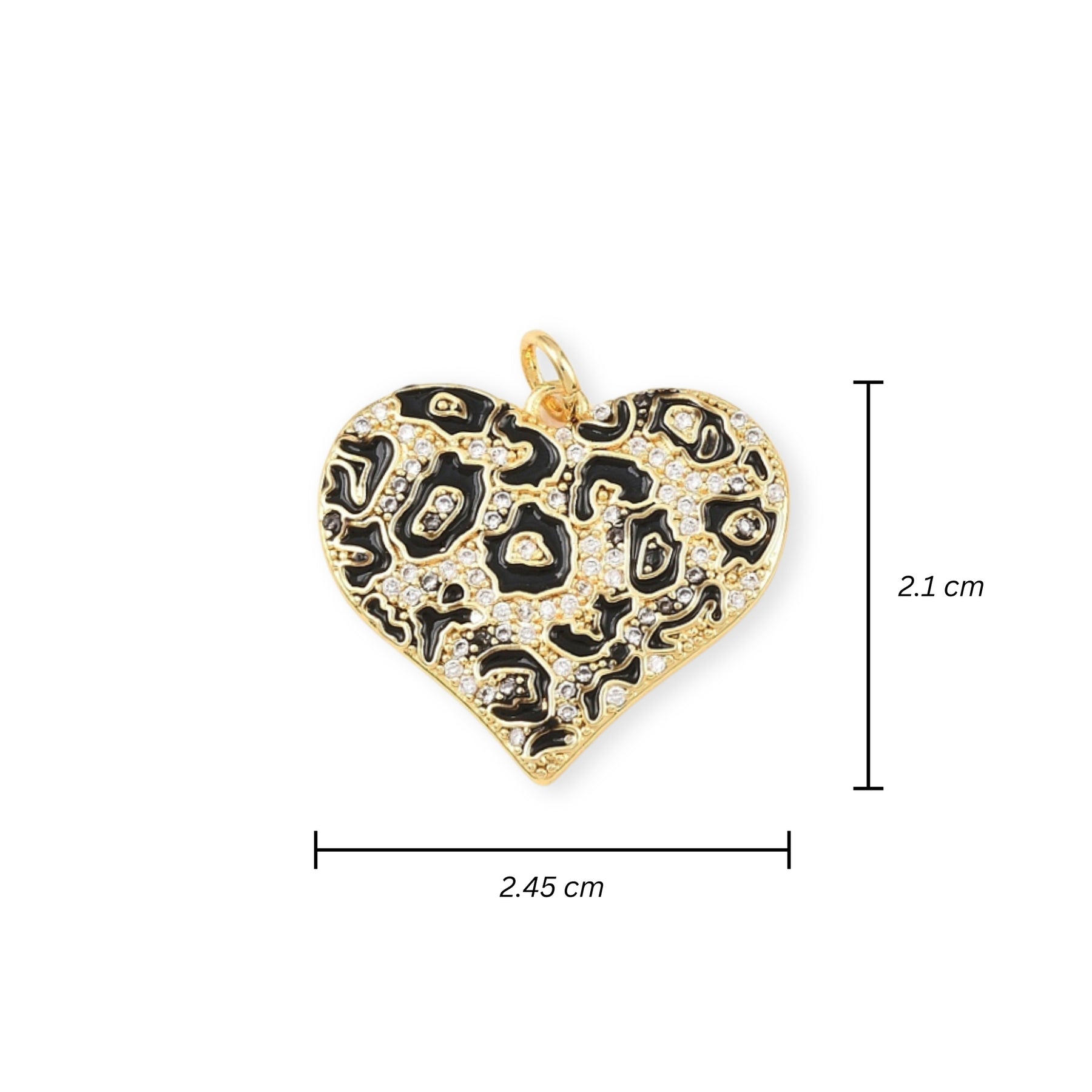 Heart-shaped pendant with animal print design made of gold plating, decorated with zirconia and colored enamel.