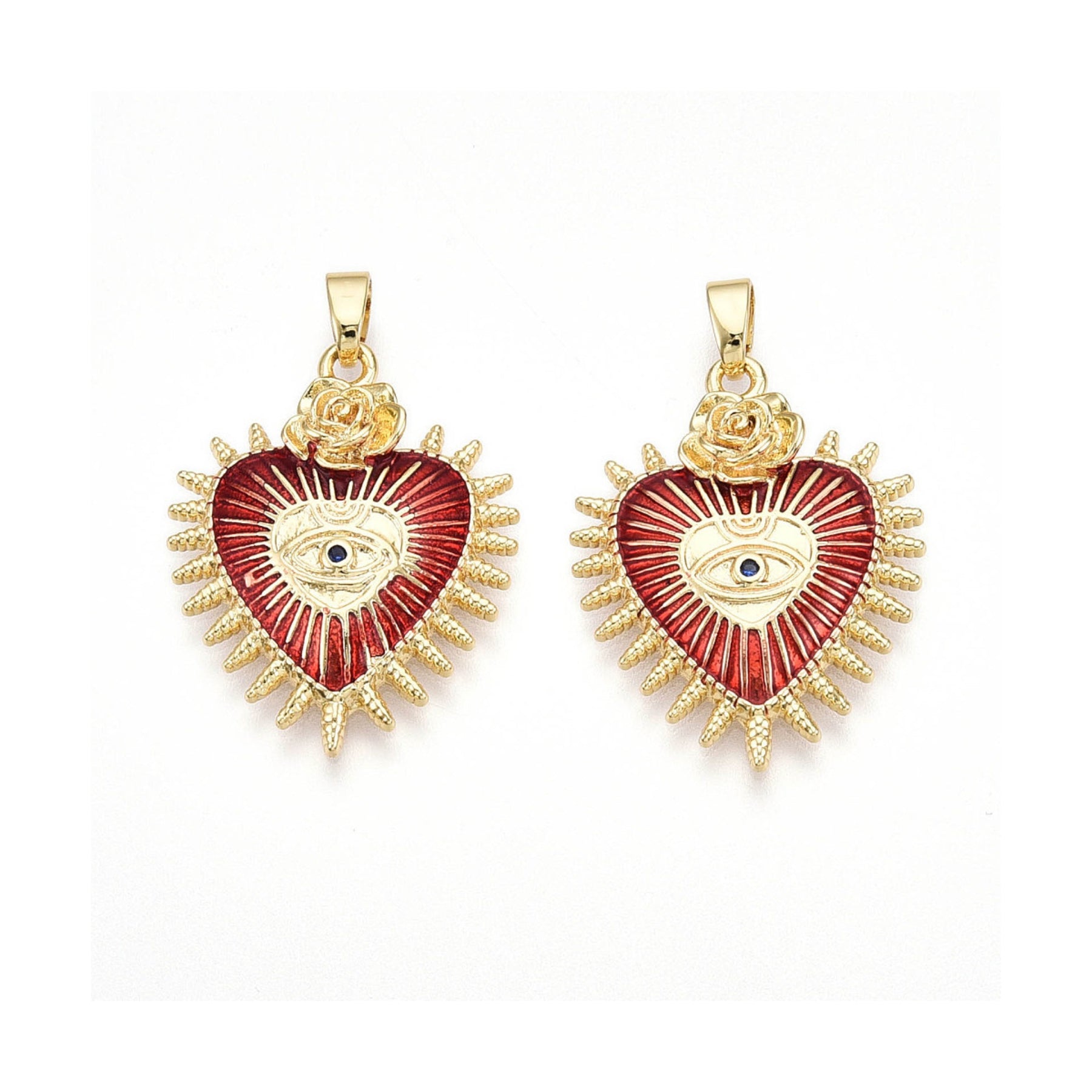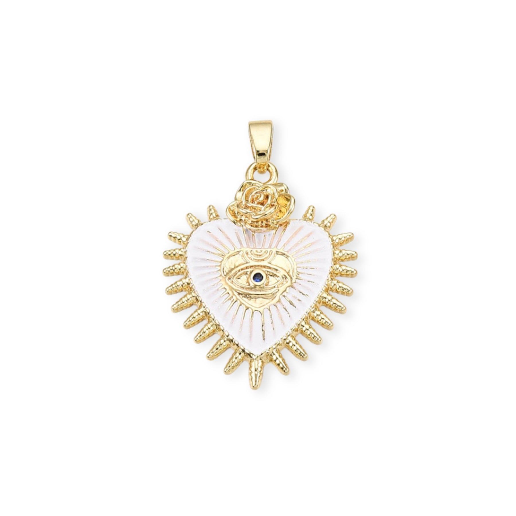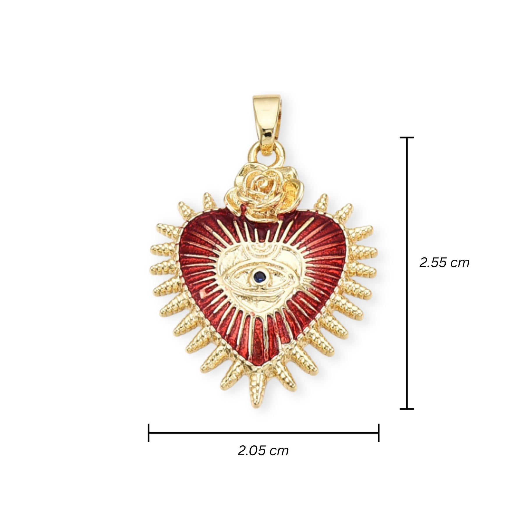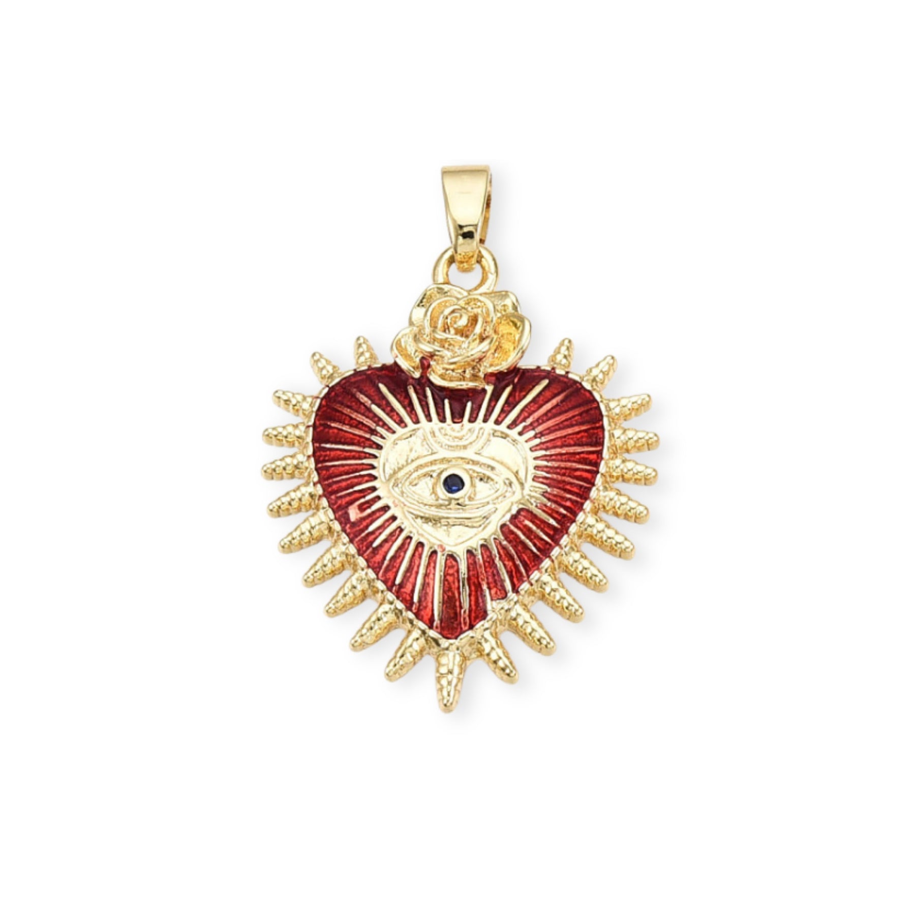 Heart-shaped pendant with eye design, made of gold plating and covered with enamel.