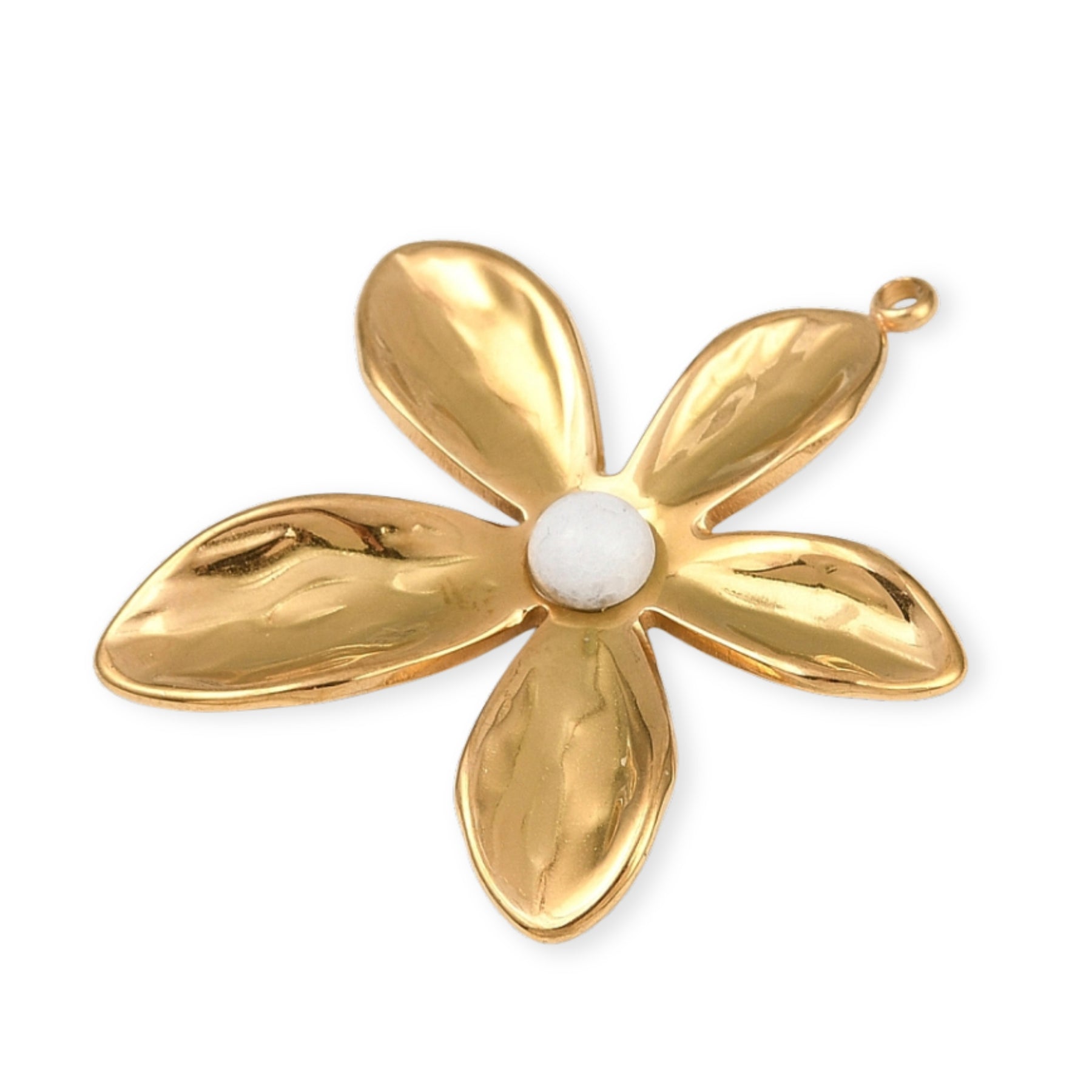 Flower-shaped pendant made of stainless steel, with a synthetic pearl in the center.