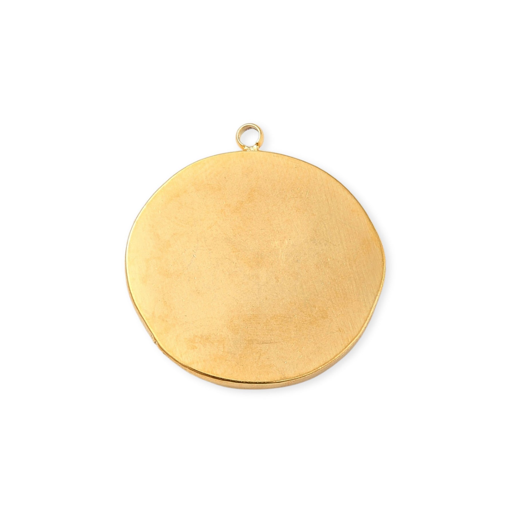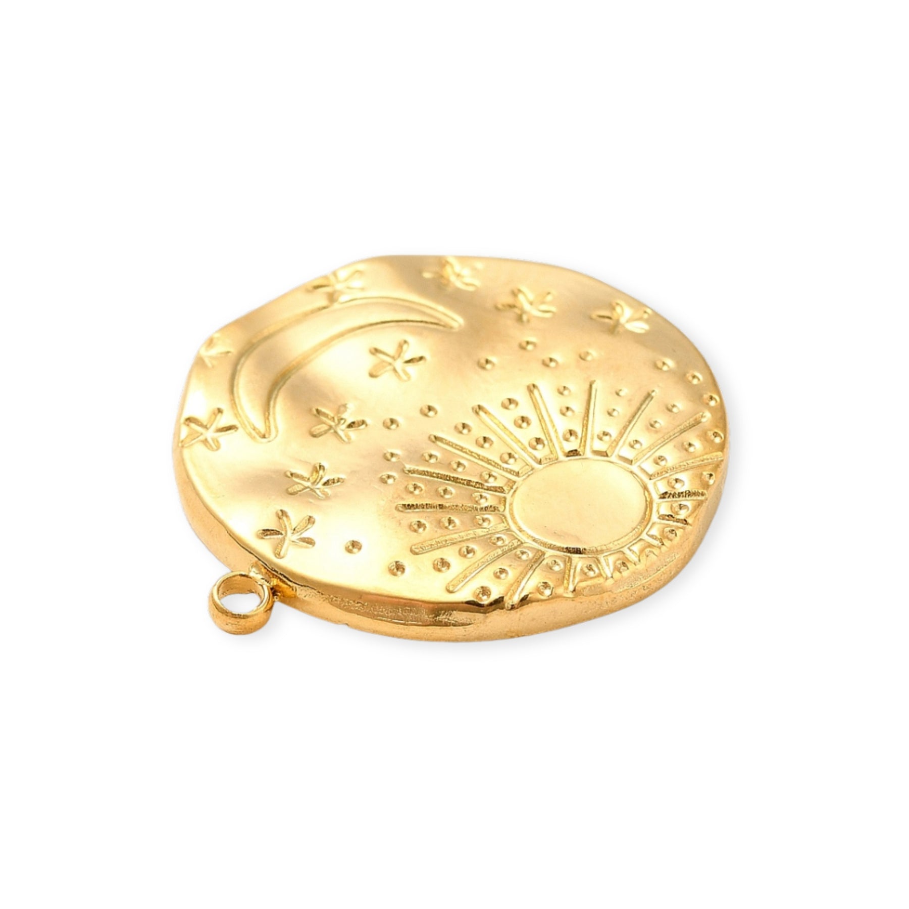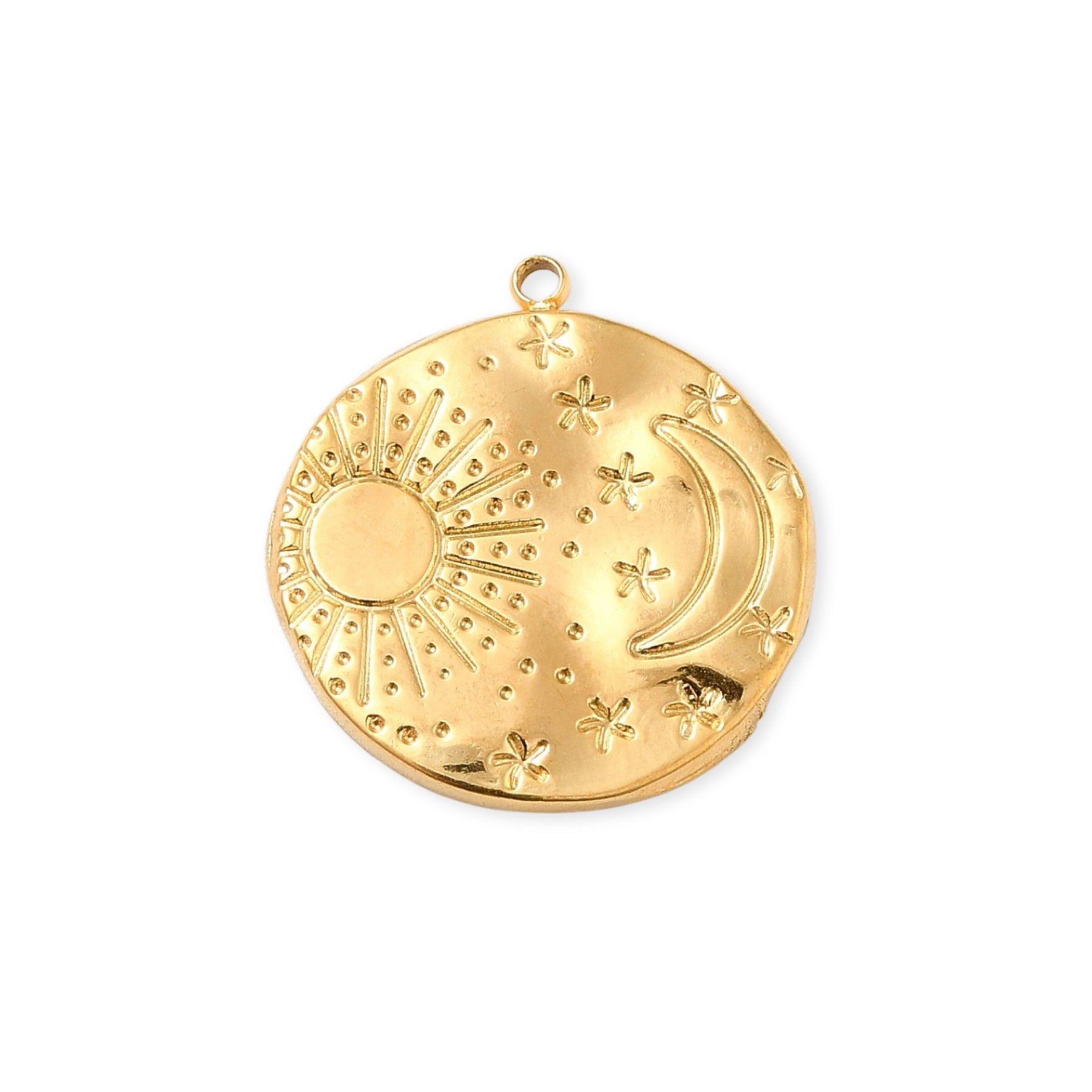 Circular pendant made of stainless steel with moon and sun engraving.