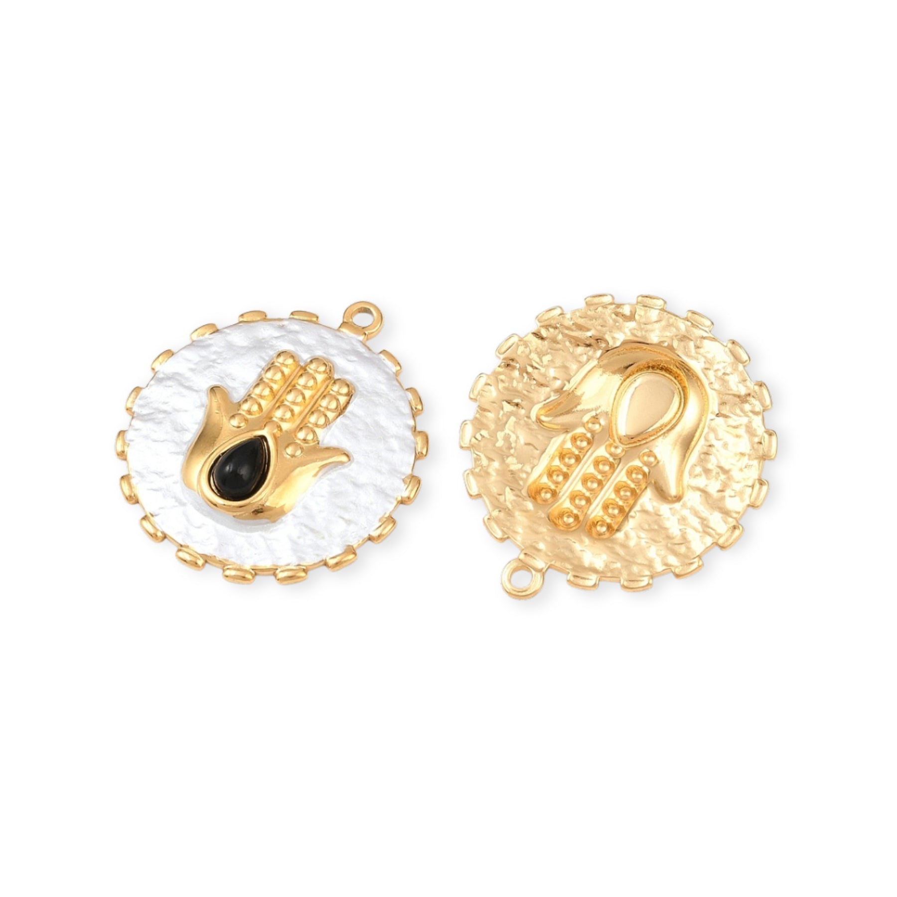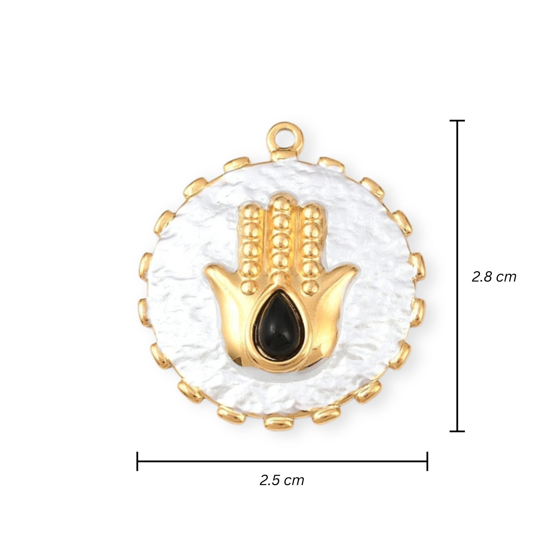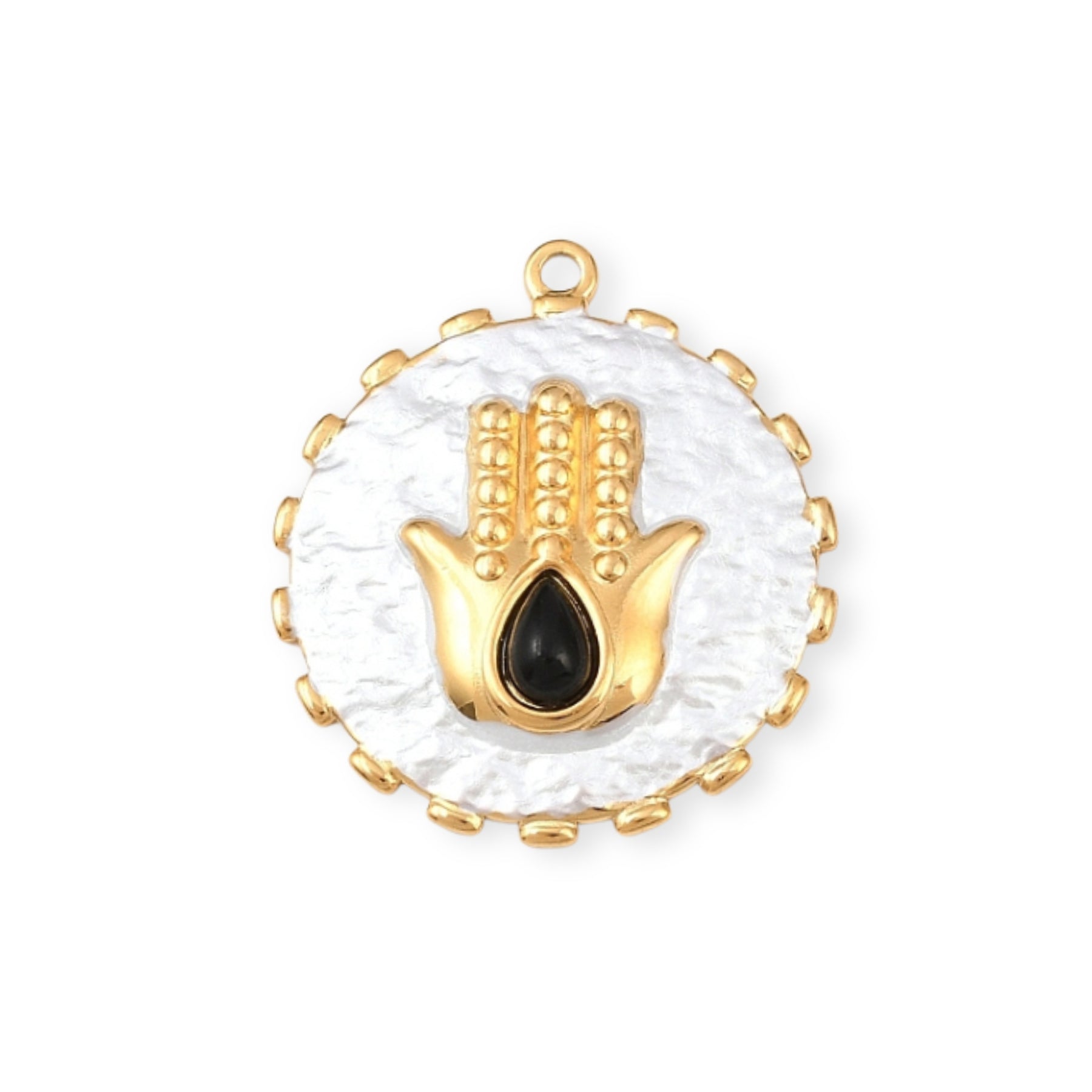Circular pendant with Hamsa made of stainless steel, with enamel and black onyx in the center.