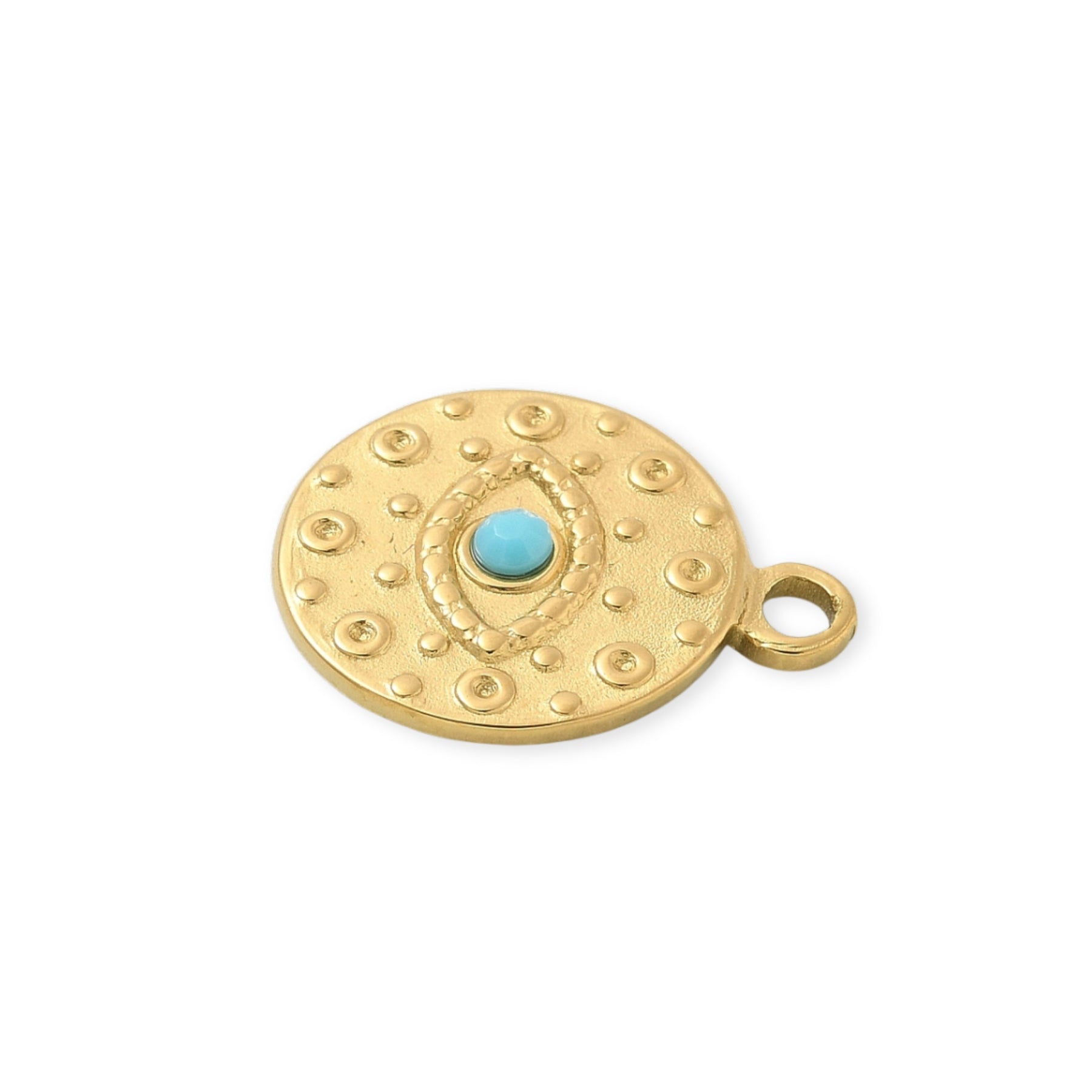 Circular pendant with eye design made of stainless steel, with sky blue enamel in the center.