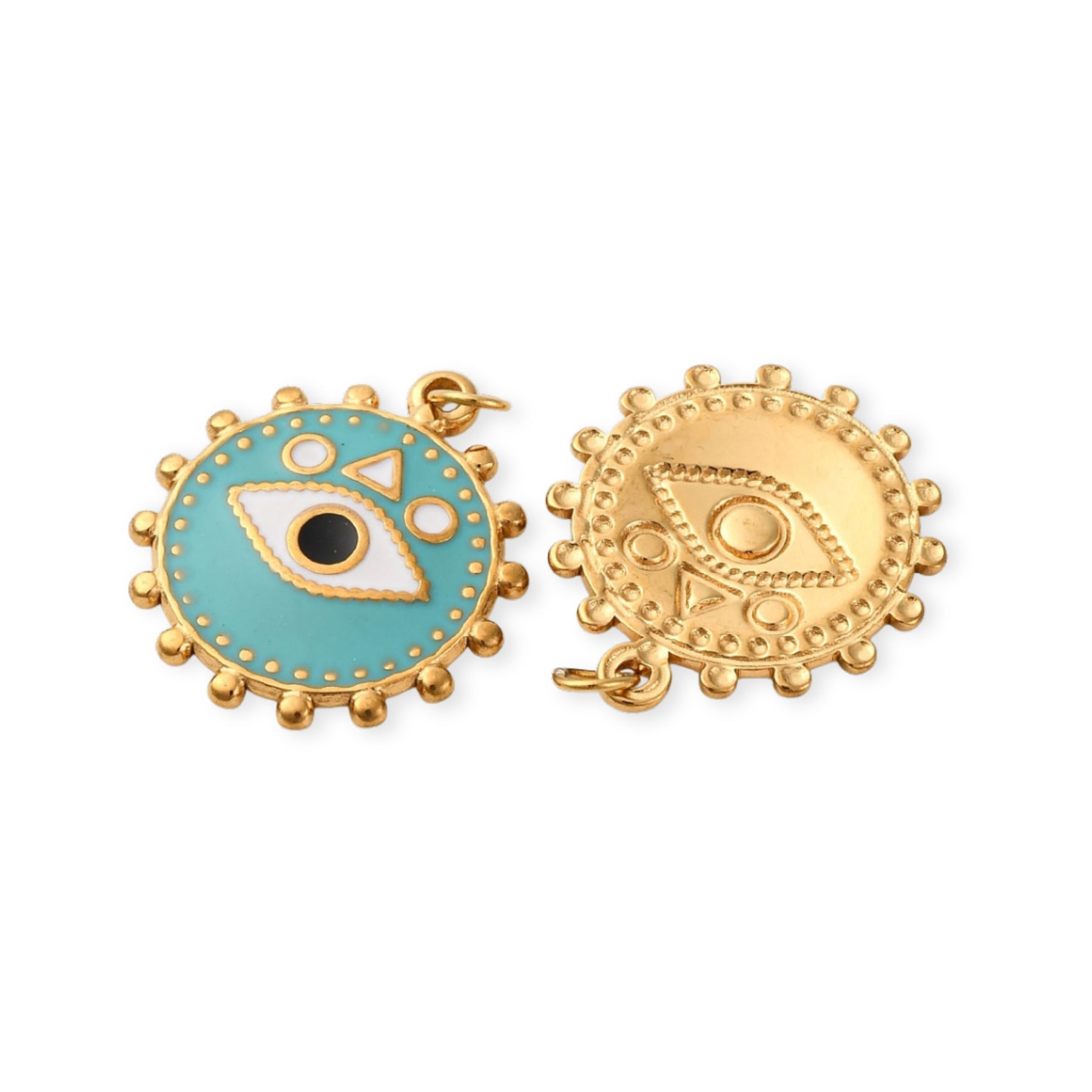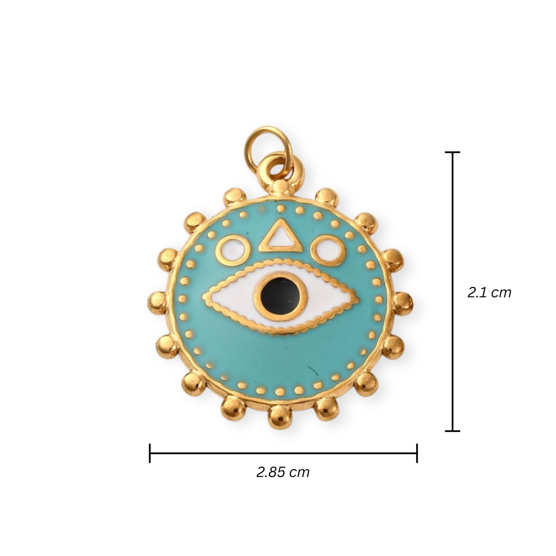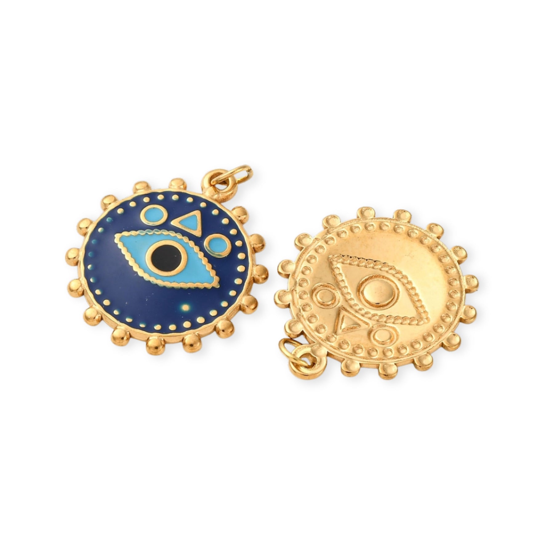 Circular stainless steel pendant with eye design in the center, covered with enamel.