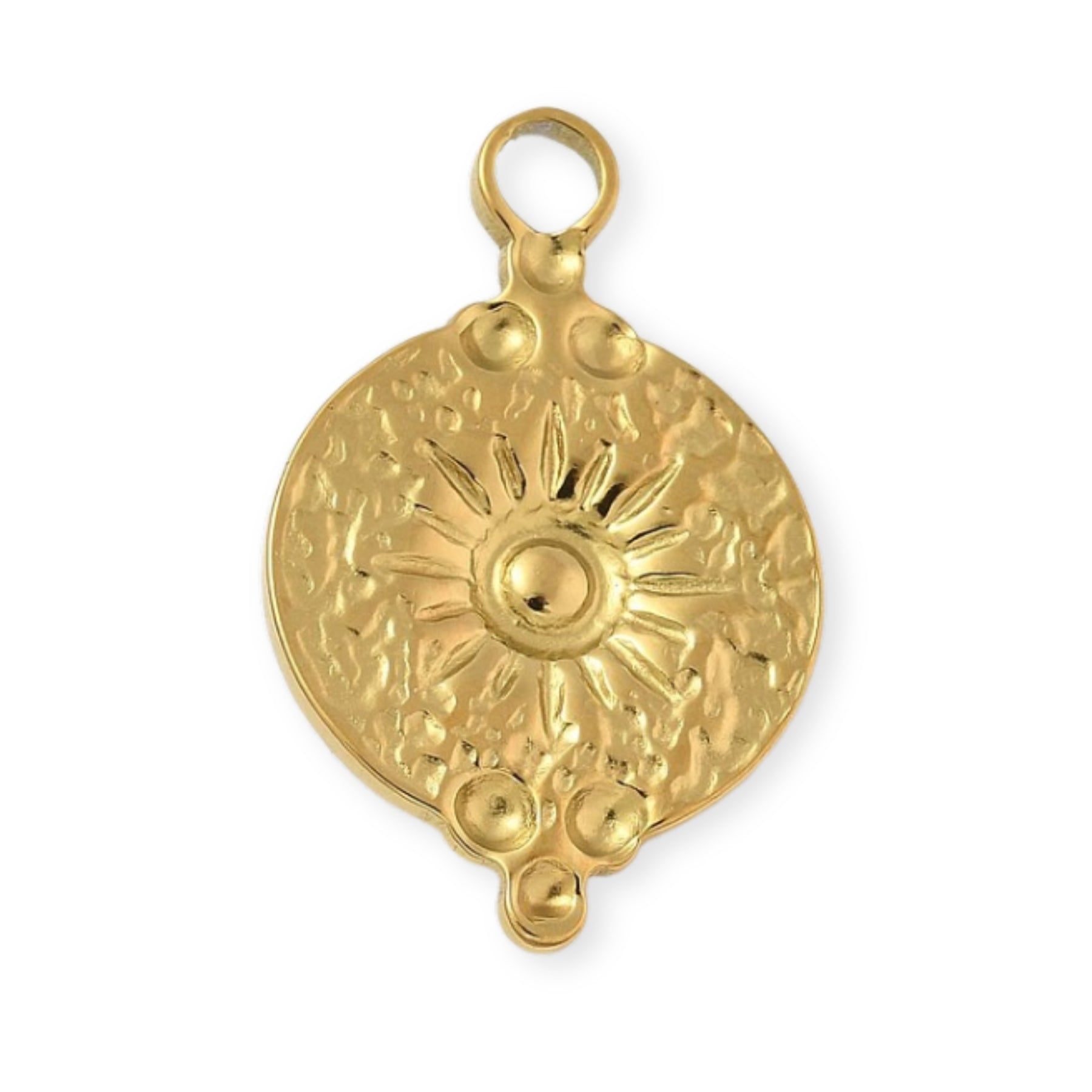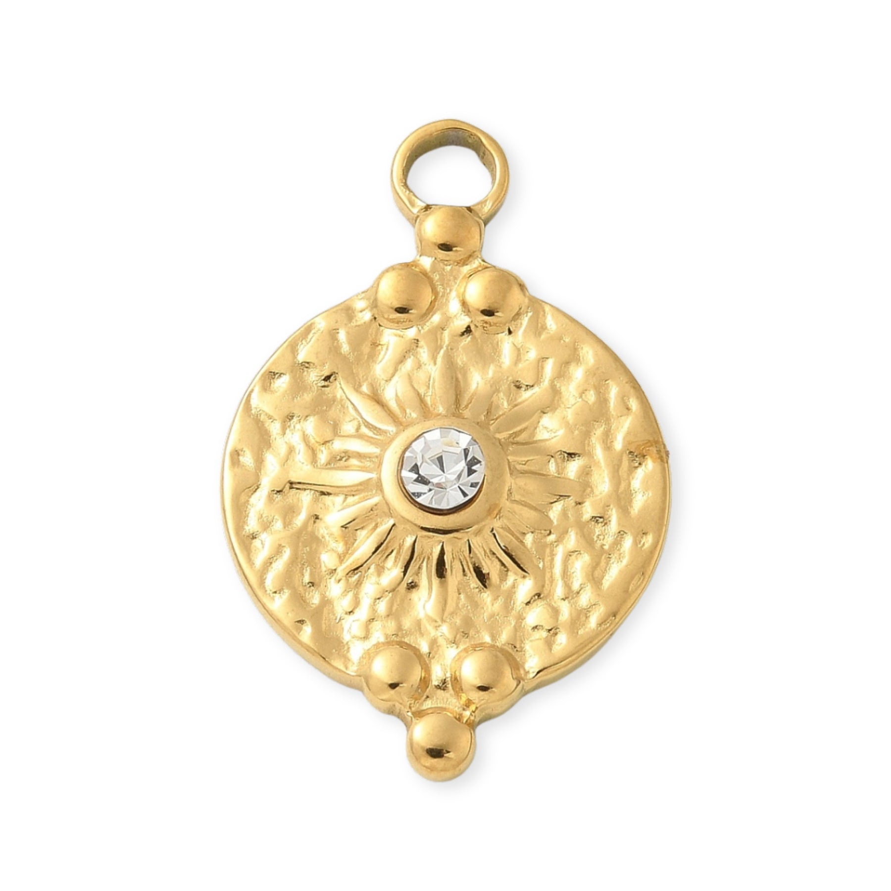 Circular sun-shaped pendant made of stainless steel, with a crystal in the center.