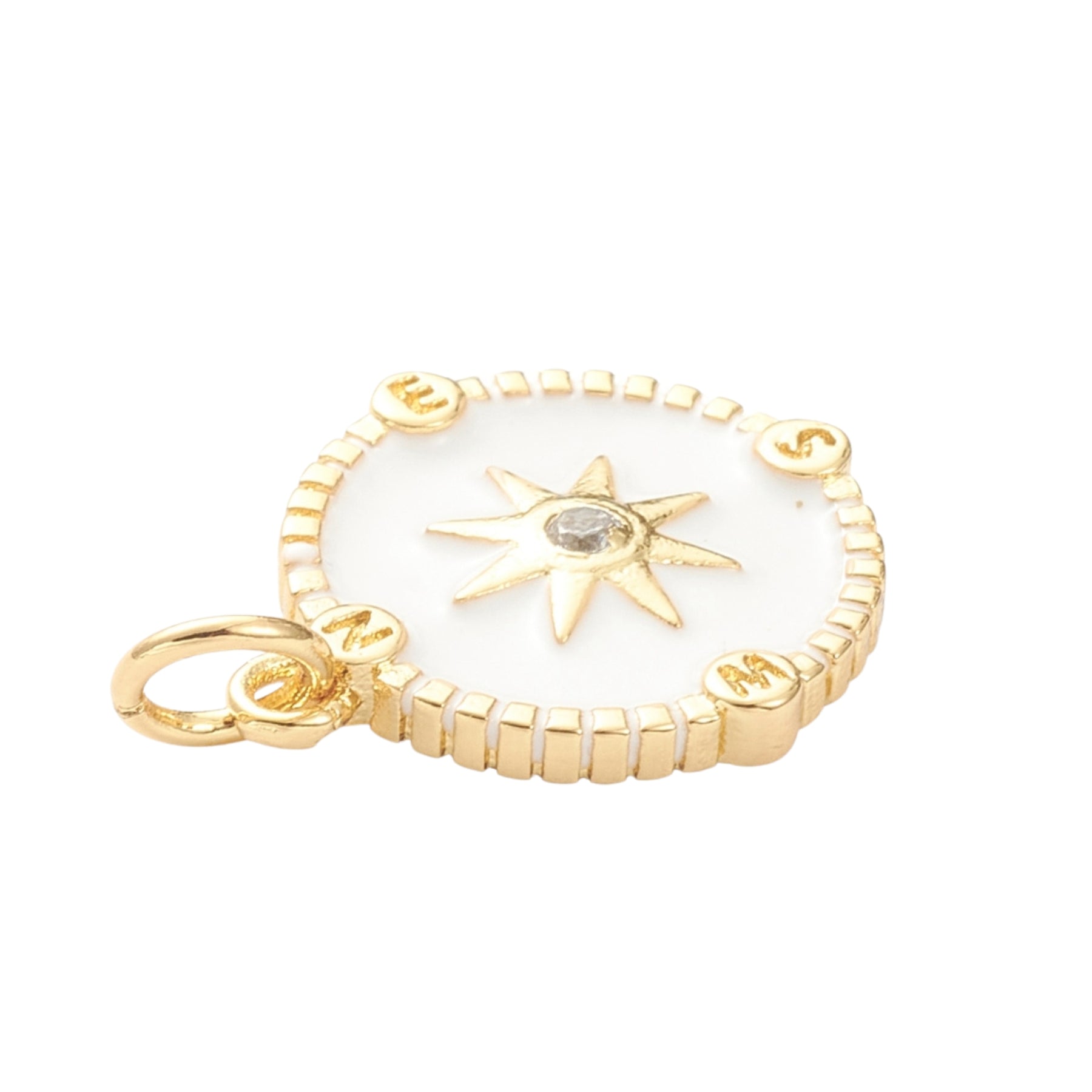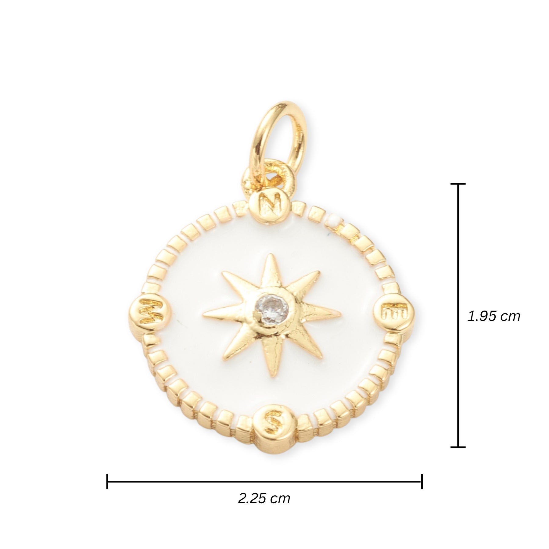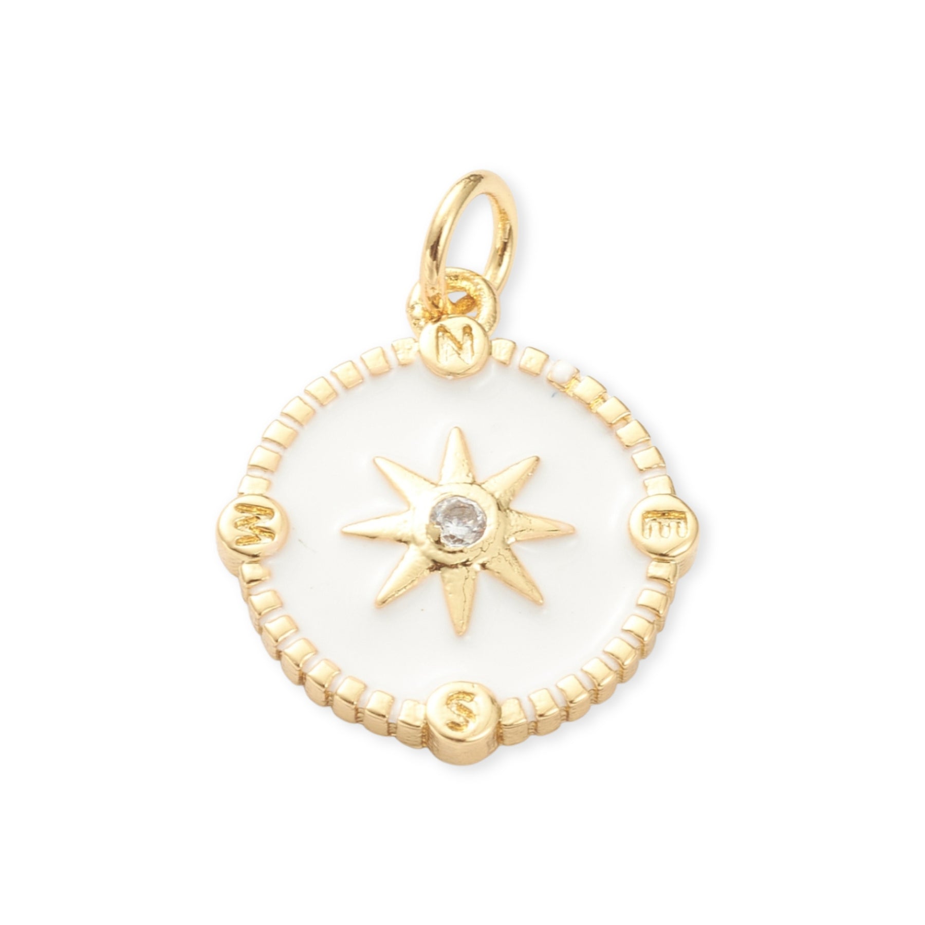 Dije circular de sol elaborado en chapa de oro, decorado con zirconia y detalles esmaltados.
