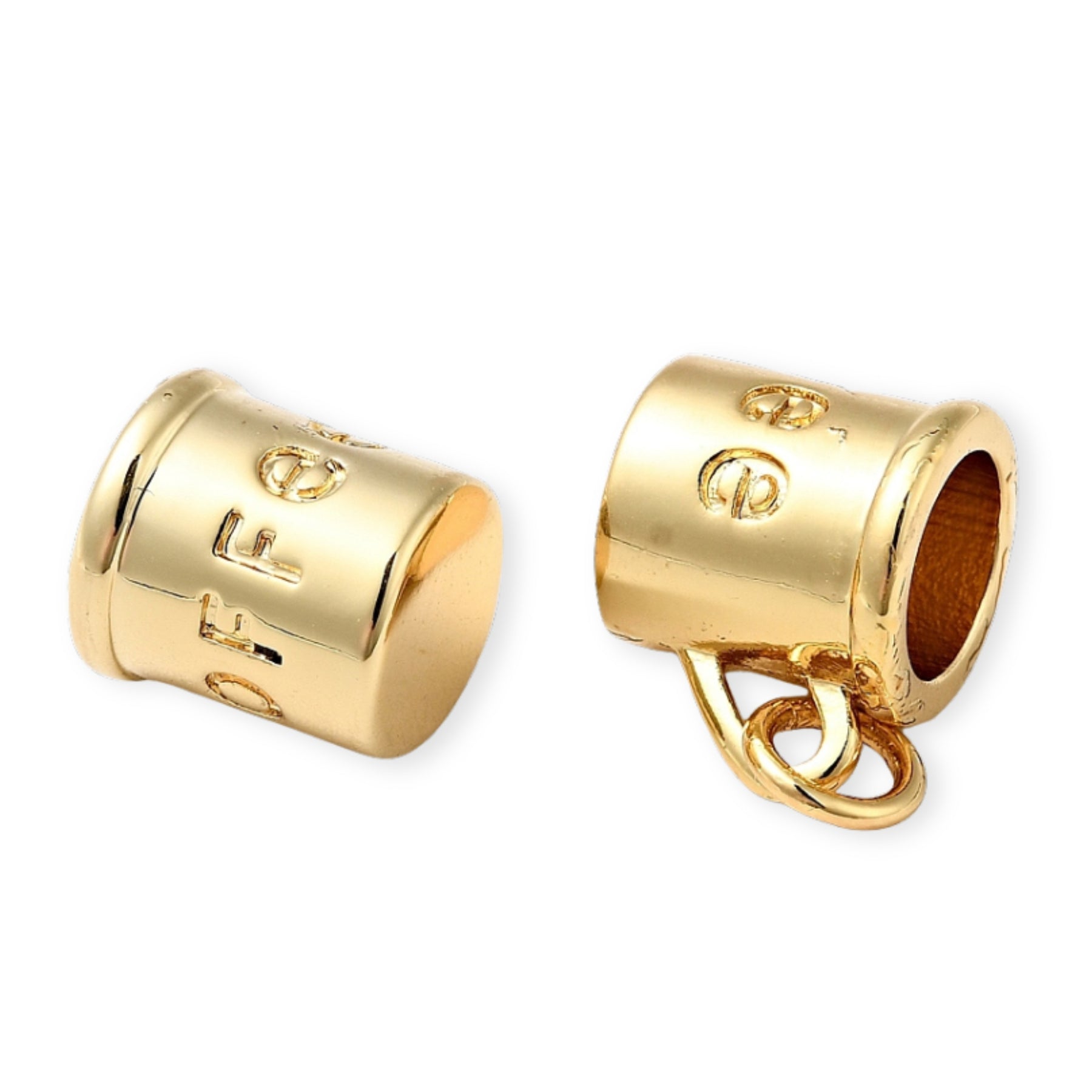 I pendant in the shape of a cup with the engraving "coffee", made of gold sheet with a shiny finish.