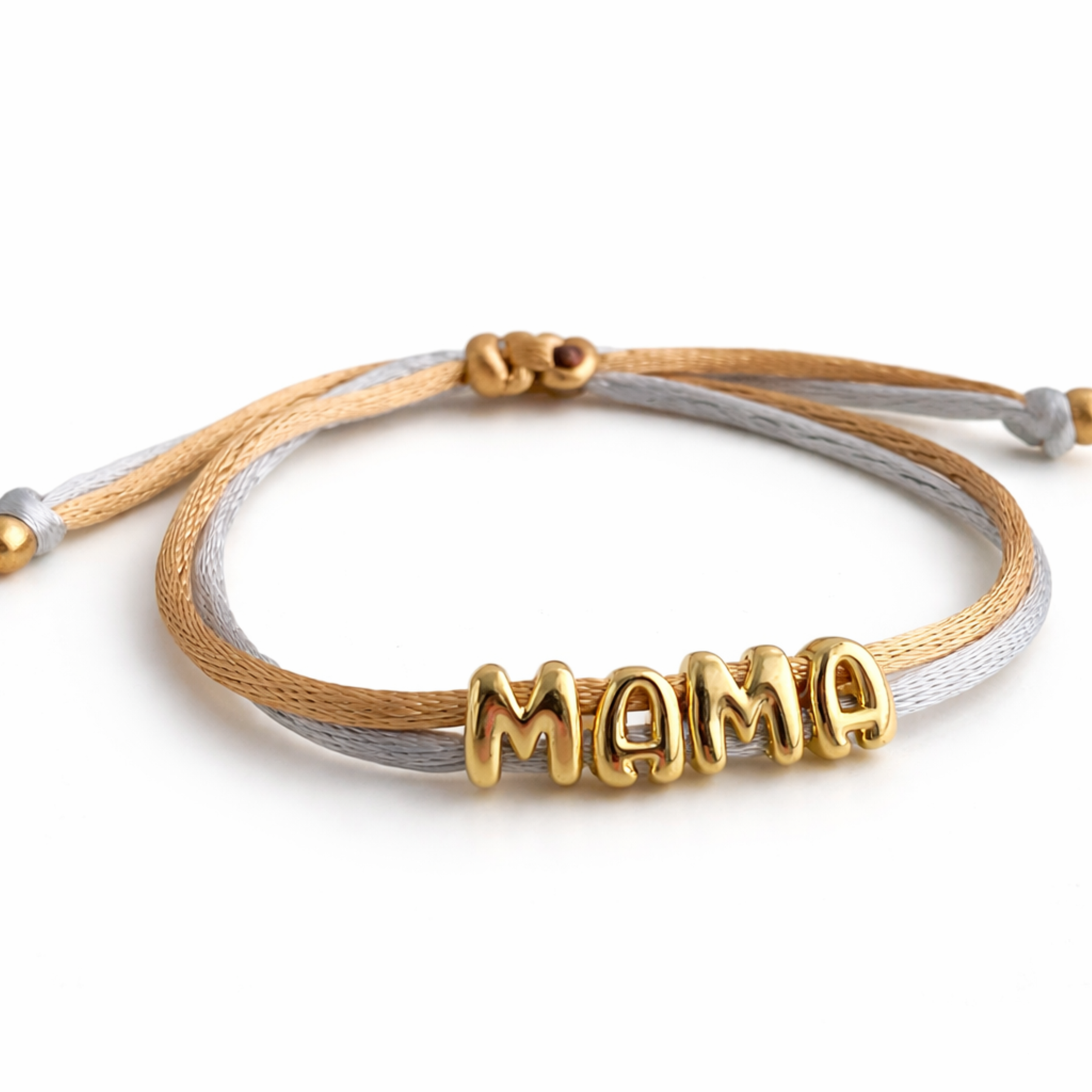 Adjustable cord bracelet with gold-plated "Mom" lettering. Bia is a minimalist and meaningful piece that elegantly honors the deepest connection: that of a mother and her unconditional love.