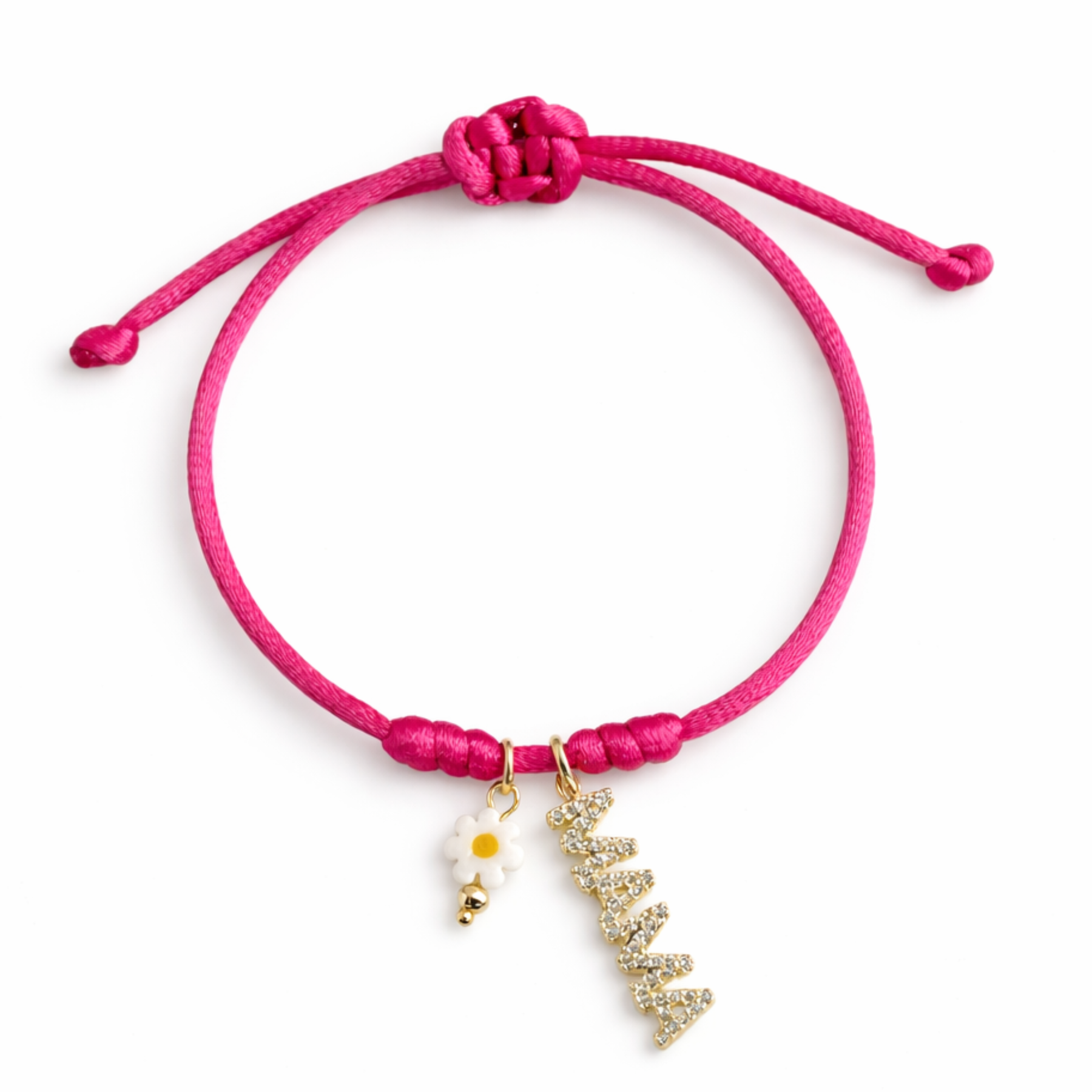 Adjustable fuchsia thread bracelet with a gold "mom" charm and a Murano glass flower. A delicate and loving gift.