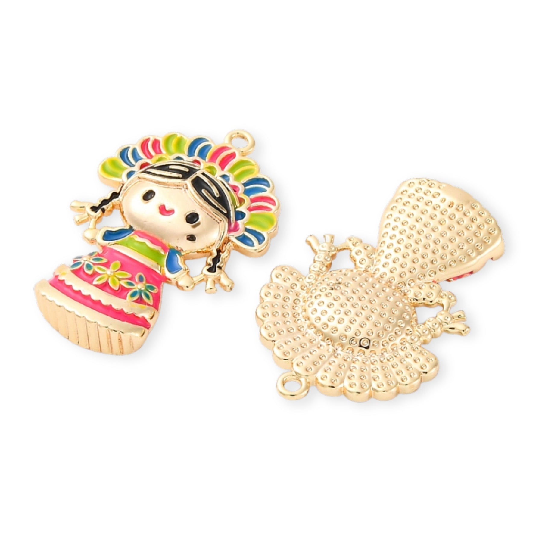 Dije en forma de muñeca Lelé, típico símbolo mexicano, elaborado en chapa de oro y esmaltado en colores vivos.