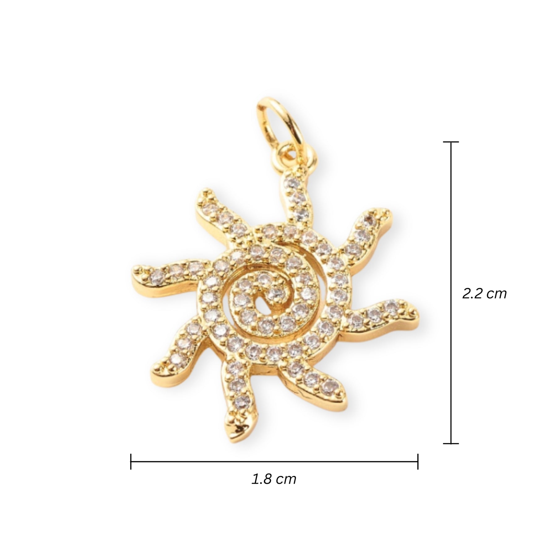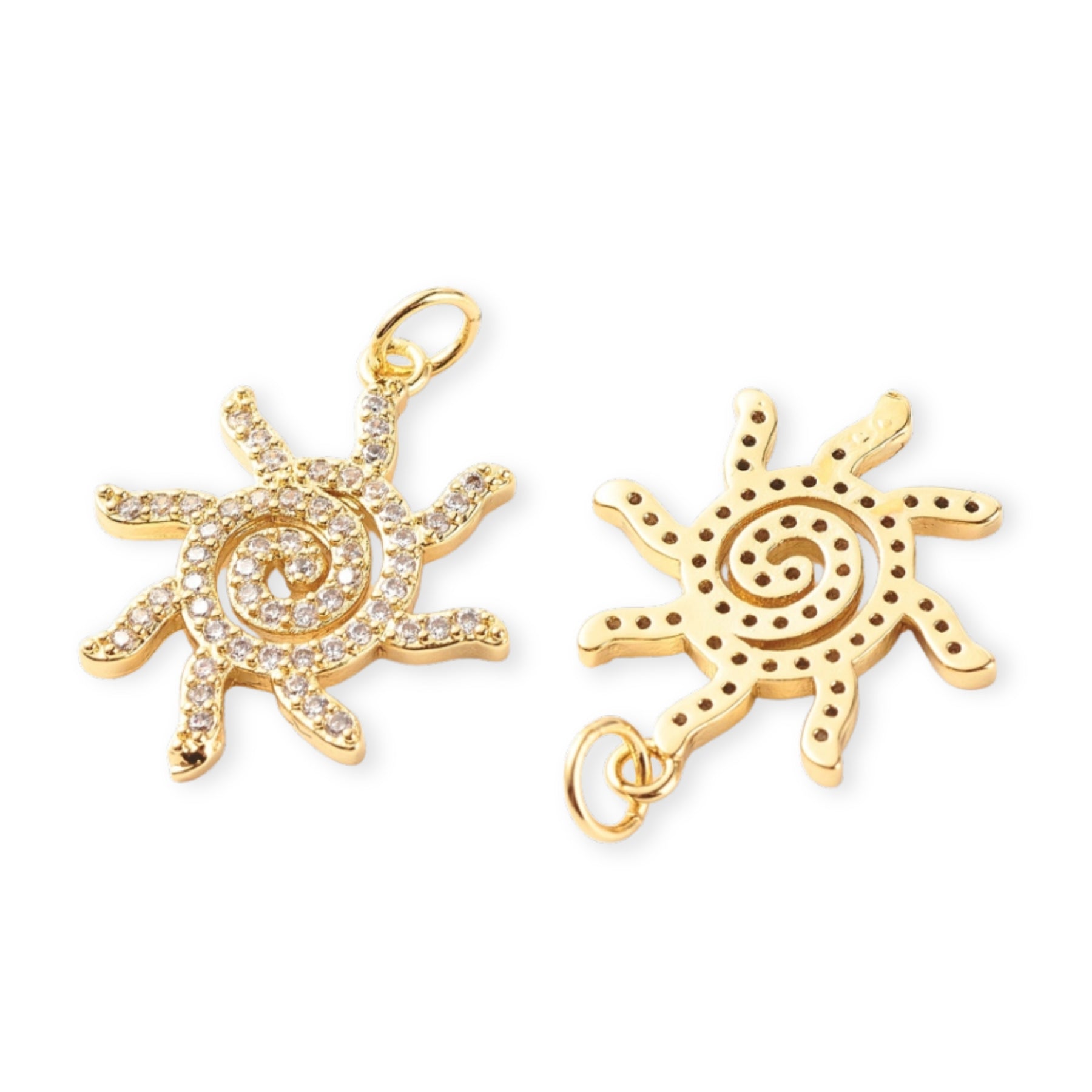 Dije en forma de sol elaborado en chapa de oro, decorado con zirconias brillantes.
